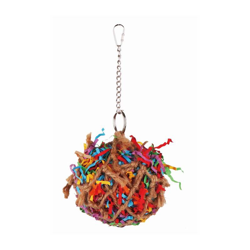 - Игрушка-подвеска в виде плетеной сетки с разноцветными бумажными хвостиками, которыми с увлечением занимаются птицы.