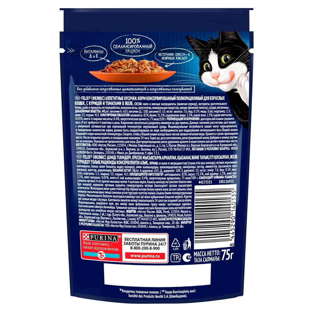 Эксперты Purina, разрабатывая влажные корма для домашних любимцев, создали корм для взрослых кошек Felix «Аппетитные кусочки» — специально для Вашего любителя вкуснятины. Влажный корм для кошек Felix Аппетитные кусочки — полнорационный, содержит все необходимое для здоровой активной долгой жизни.
