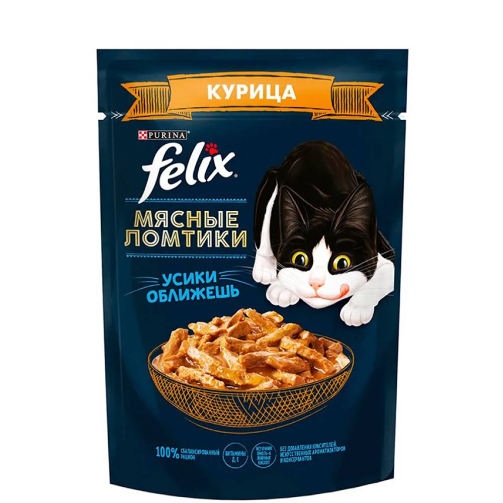 Felix Влажный корм (пауч) для взрослых кошек Мясные ломтики, с курицей в соусе, 75 гр.
