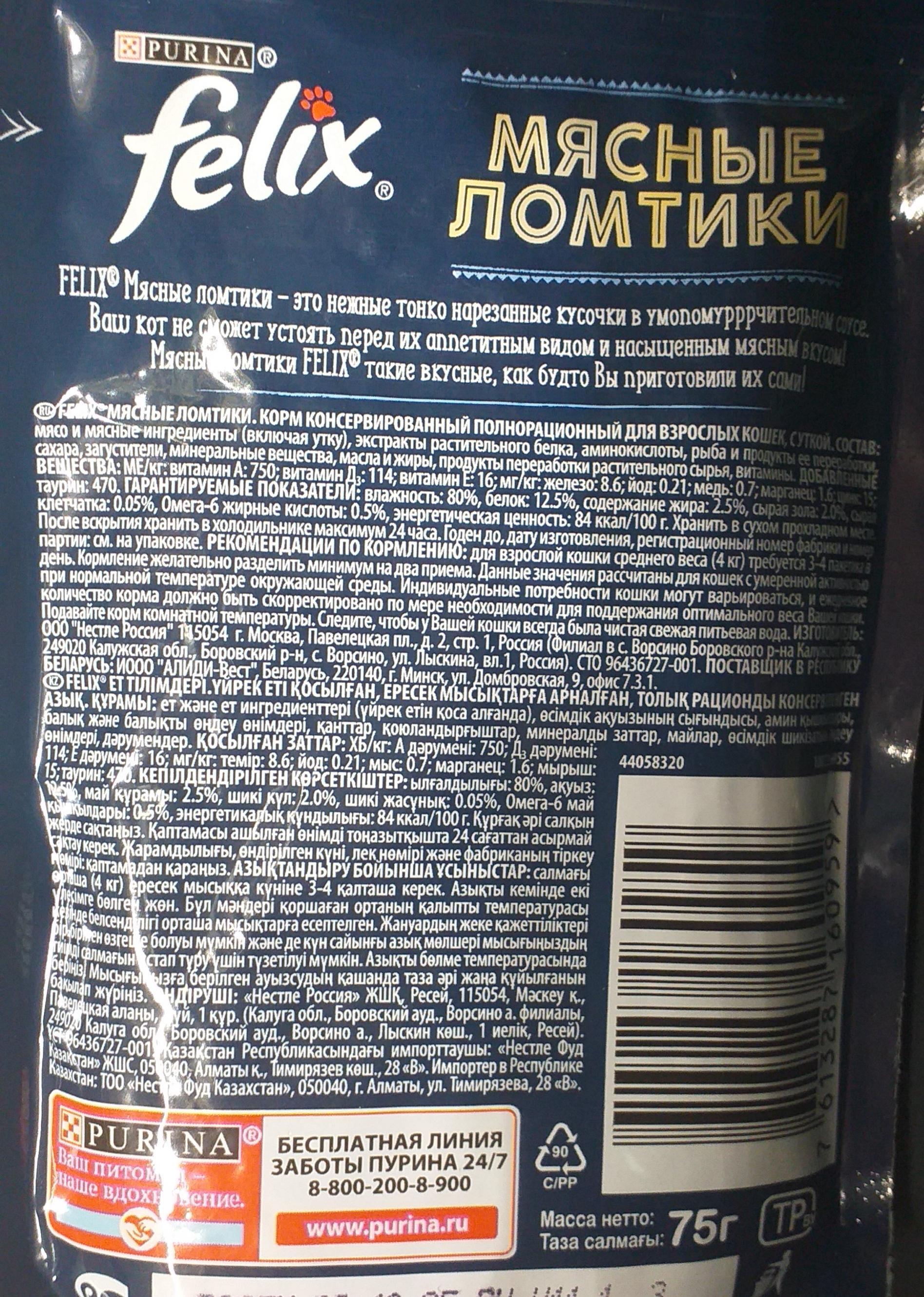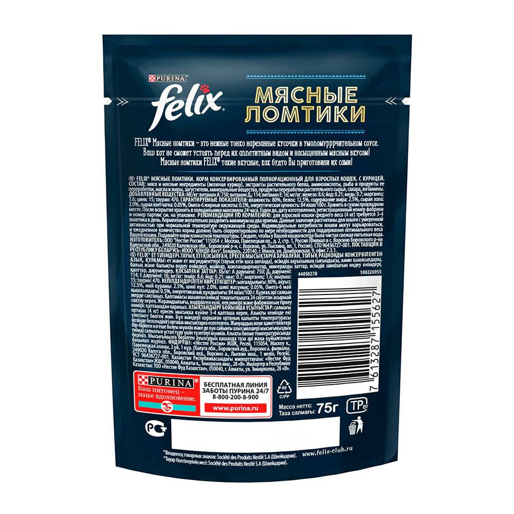 Один из немногих кормов, который всегда с аппетитом ест наш кот. Сочетаем вместе с сухим кормом. Одного пакетика хватает на день. Ещё нравиться, что есть на выбор разные вкусы и котейка всегда доволен!Татьяна -.
