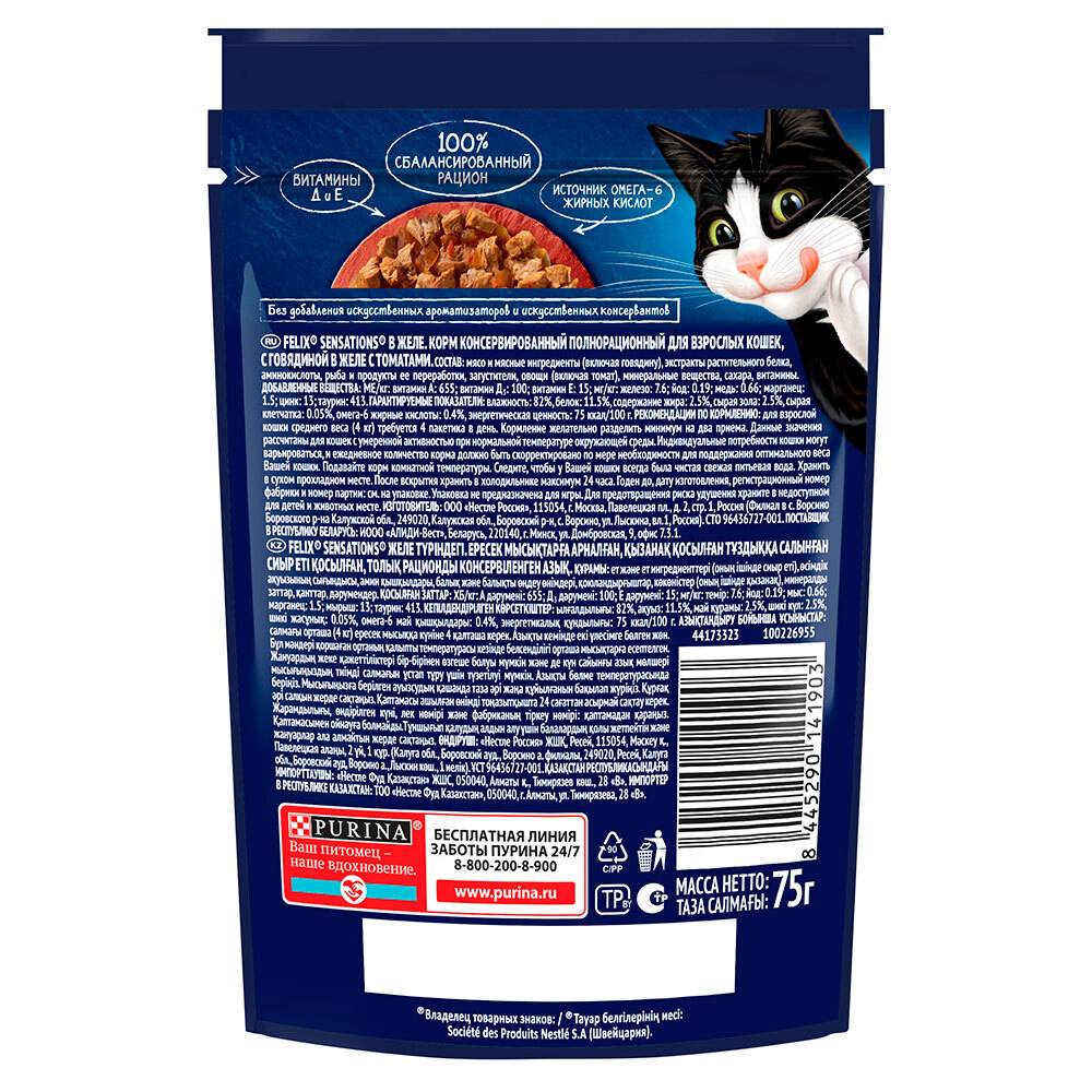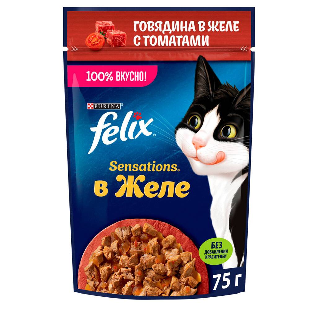 Felix Sensations Влажный корм (пауч) для взрослых кошек, с говядиной в желе с томатами, 75 гр.