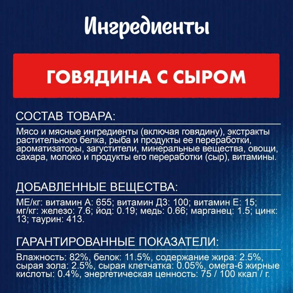 мясо и мясные ингредиенты (включая говядину), экстракты растительного белка, рыба и продукты ее переработки, ароматизаторы, загустители, минеральные вещества, овощи, сахара, молоко и продукты его переработки (сыр), витамины.