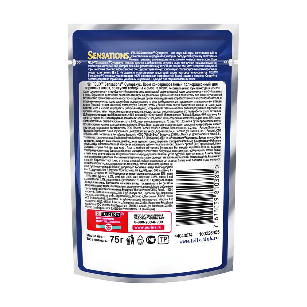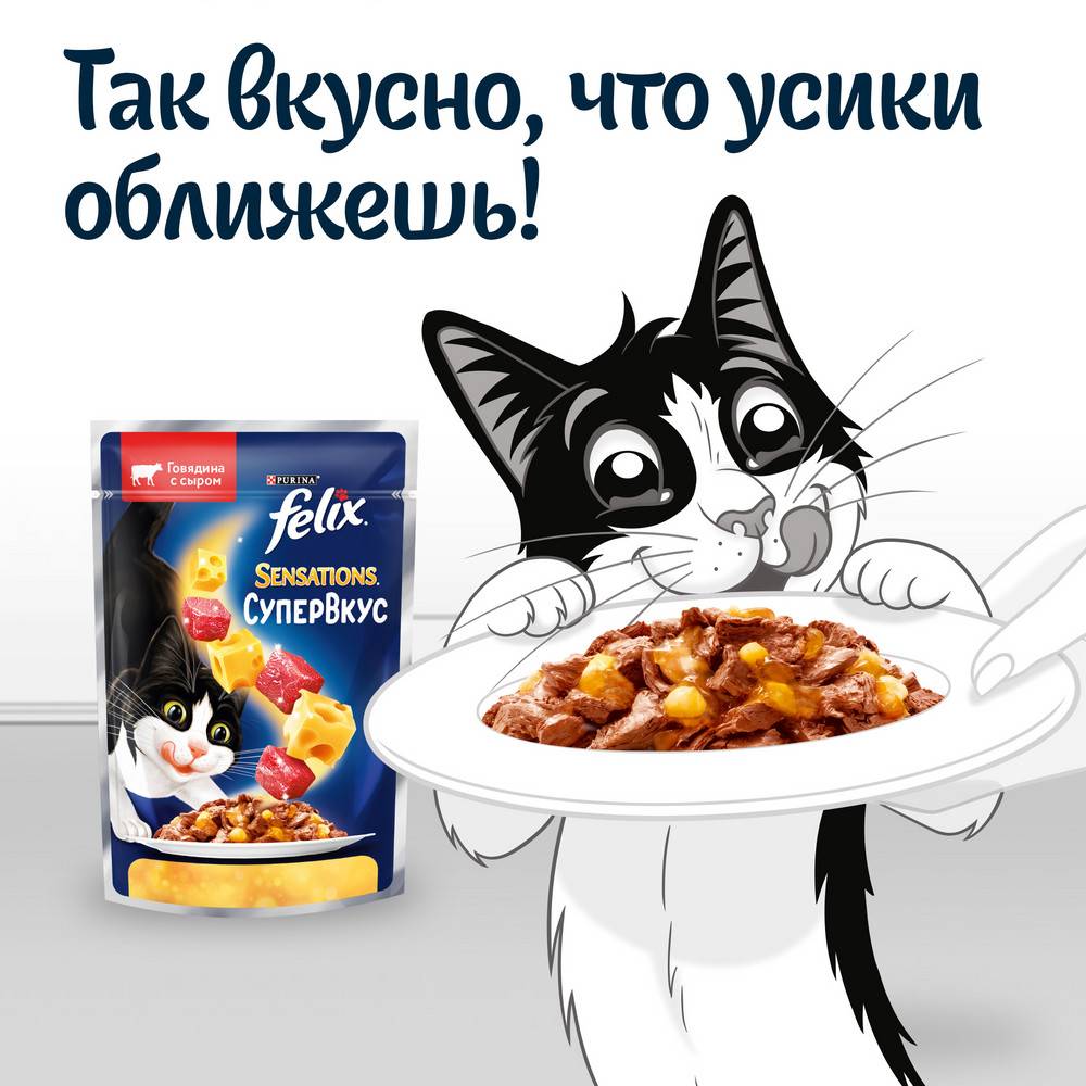 Sensations в переводе — это и «ощущения», и нечто сенсационное. А если это «супер» вкус — то эффект многократно усилен. Эксперты Purina, разрабатывая влажные корма для домашних питомцев, создали влажный корм для взрослых кошек Felix «Sensations Супервкус». Влажный корм «Супервкус» с восхитительным вкусом говядины и сыра подарит Вашему любимцу богатейшую палитру супер-ощущений вкуса и аромата.