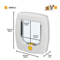 Двери Swing оборудованы системой защиты от сквозняков (кроме моделей 1 и 3). Еще одна отличительная особенность - четыре режима работы (кроме модели Swing 1), среди которых вы можете выбрать нужный вам: только вход, только выход, вход и выход, закрыто. В моделях Swing 5 и 7 имеется индикатор последнего входа-выхода животного - специальный флажок в нижней части дверки, который поможет вам понять, где находится ваш питомец. Большие модели идут в комплекте с туннелями глубиной 5 см, , которые можно регулировать, для установки в любые двери. Для моделей Swing 5, 1 и 3 расширительный туннель доступен в качестве дополнительной запчасти и имеет ширину 5 см (винты в комплект не входят).