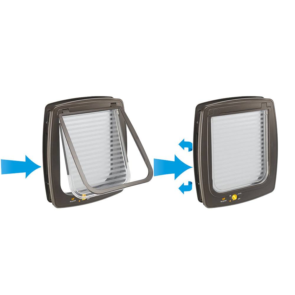 Двери Swing оборудованы системой защиты от сквозняков (кроме моделей 1 и 3). Еще одна отличительная особенность - четыре режима работы (кроме модели Swing 1), среди которых вы можете выбрать нужный вам: только вход, только выход, вход и выход, закрыто. В моделях Swing 5 и 7 имеется индикатор последнего входа-выхода животного - специальный флажок в нижней части дверки, который поможет вам понять, где находится ваш питомец. Большие модели идут в комплекте с туннелями глубиной 5 см, , которые можно регулировать, для установки в любые двери. Для моделей Swing 5, 1 и 3 расширительный туннель доступен в качестве дополнительной запчасти и имеет ширину 5 см (винты в комплект не входят).