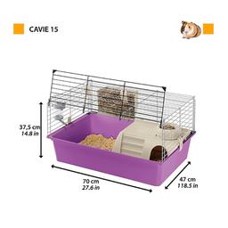 Cavie 15 - клетка для морских свинок с инновационной системой окрывания/закрывания двери, обеспечивающей вашему питомцу еще большую безопасность. Клетка выполнена в традиционном стиле и состоит из окрашенной стальной проволоки и пластикового поддона. Передняя дверка полностью открывается, что облегчает процесс уборки. В комплекте вы найдете аксессуары, среди которых поилка, кормушка для сена, миска и пластиковый домик для отдыха. Cavie 15 - экологически безопасный продукт, входящий в группу товаров Save Space. Она продается в компактной упаковке и полностью разбирается.