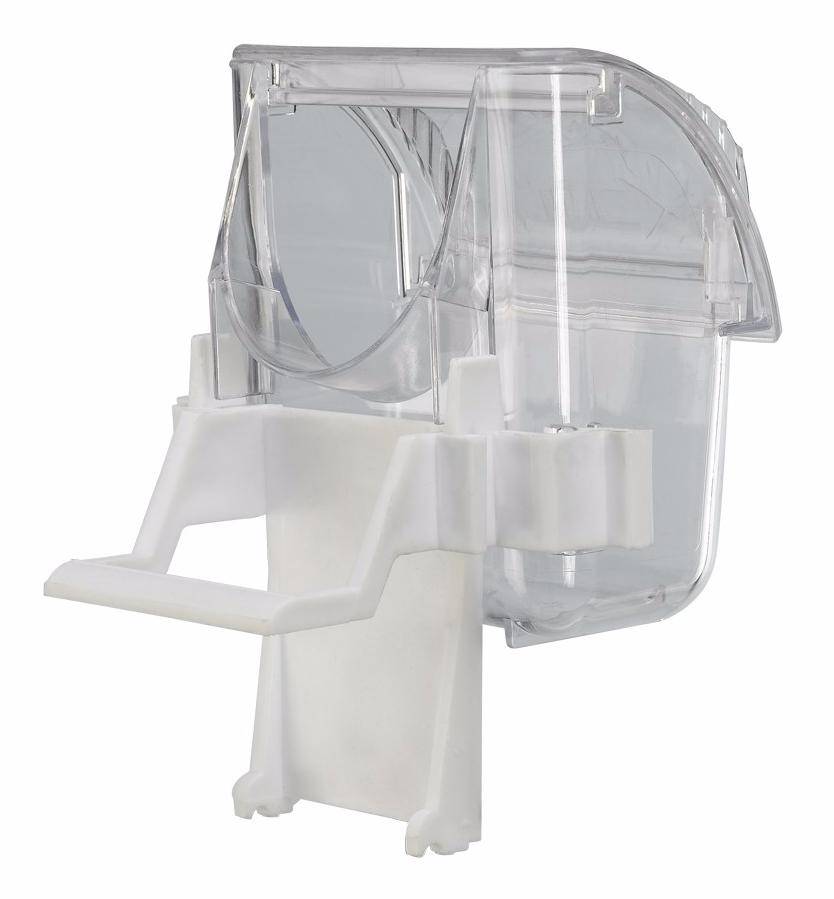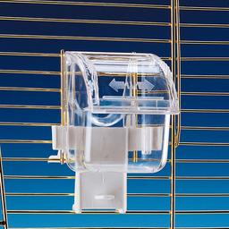 Кормушка для канареек и экзотических маленьких птиц из прочного прозрачного пластика. Идет в комплекте с креплениями к клеткам с вертикальными и горизонтальными решетками.