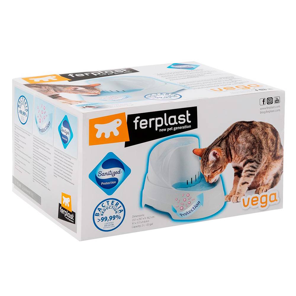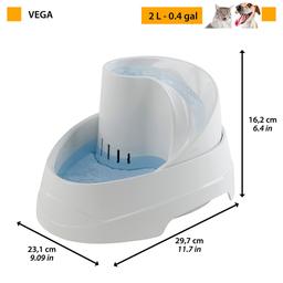 Её особенность заключается в том, что непрерывный поток воды, имитирующий настоящий водопад, пробуждает в животных естественное желание попить. Поилка имеет округлую форму и оснащена ручкой для удобного перемещения, практичные антискользящие ножки обеспечивают дополнительную устойчивость. Поилка Vega имеет три различных уровня для воды — один в нижней части и два в верхней. Vega поставляется в комплекте с угольным фильтром, чтобы сделать воду кристально чистой. Также в комплекте насос мощностью 12 Вт с максимальной производительностью 250л/ч и адаптер. Поилку Vega легко чистить благодаря возможности отсоединить нижнюю часть от основания.