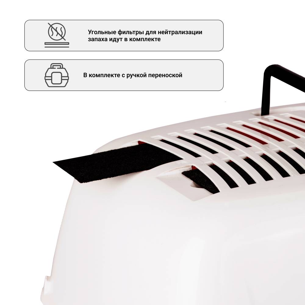 Prima - практичный закрытый туалет для кошек из пластика, оборудованный всем необходимым для полного уединения вашей кошки. Идет в комплекте с ручкой для переноски и угольными фильтрами для нейтрализации запаха. Туалет легко мыть благодаря простой системе крепления поддона. Туалет Prima недавно был обновлен и теперь, благодаря закругленной форме, предоставляет еще больше пространства и комфорта вашему питомцу.