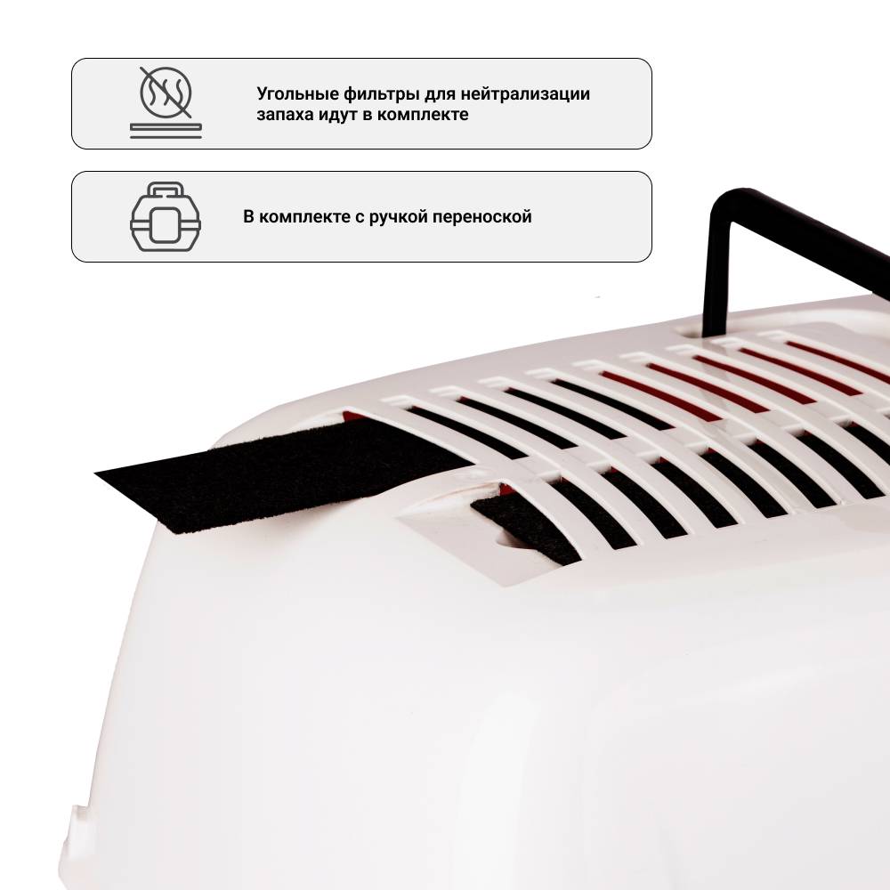 Удобно убирать, крышка легко снимается. Фильтров два, они сдерживают запах вместе с наполнитель и средством от запаха. Кошка знает как им пользоват...