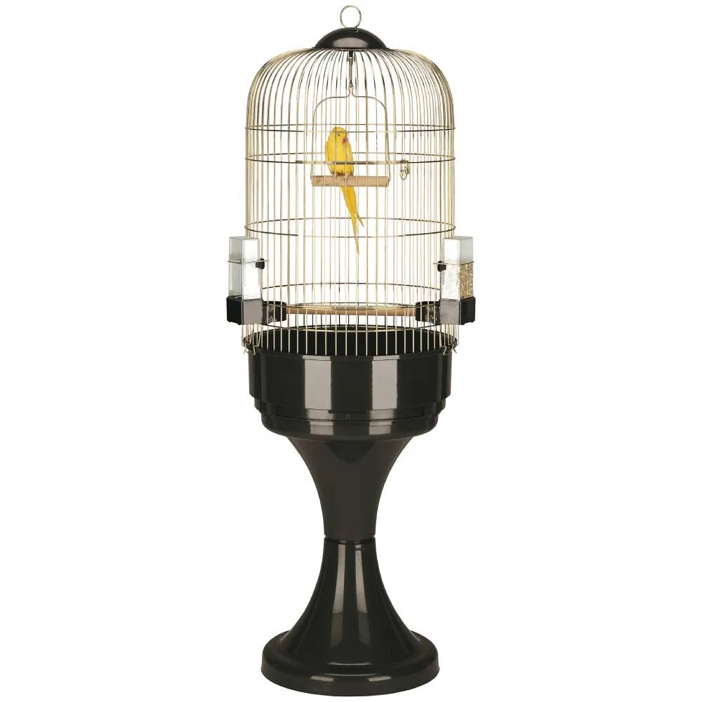 Покрытие решетки с металлическим эффектом, похожим на латунь, хорошо сочетается с темным основанием, оснащенным двумя поддонами для сбора мусора. На дне клетки находится съемная защитная решетка, предохраняющая лапы вашей птицы от соприкосновения с остатками еды и другими отходами.