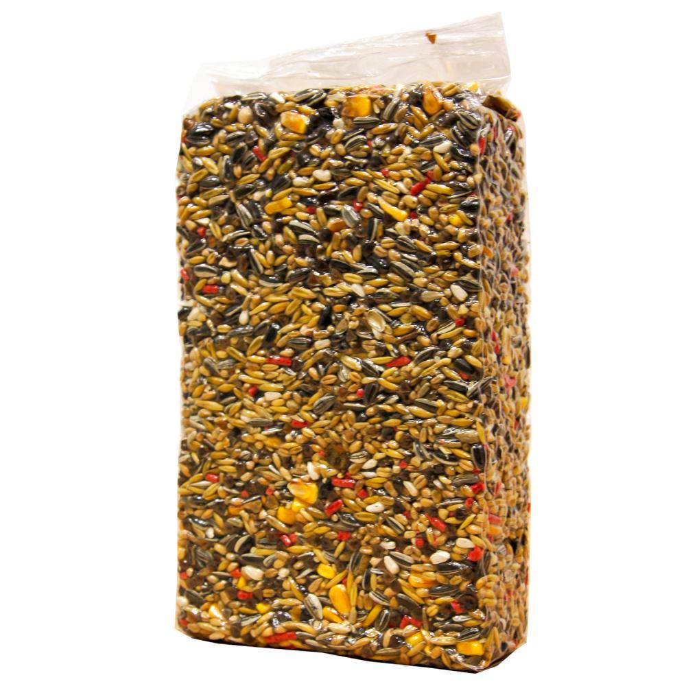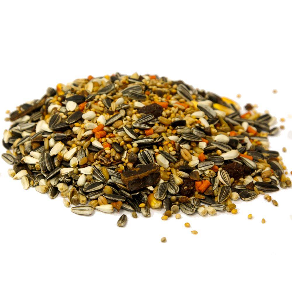 Семена: подсолнечника полосатые, просо желтое, сафлор, просо белое, канареечник, пшеница, просо красное, кукуруза, гречиха, очищенный овес, гранулы (пекарные продукты, злаки и зерновые продукты, мёд 10%, масла, экстракт юкки Шидигера, красители и консерванты, одобренные ЕС) 4,1%, изюм 4,1%, бобы рожкового дерева, конопляное семя.