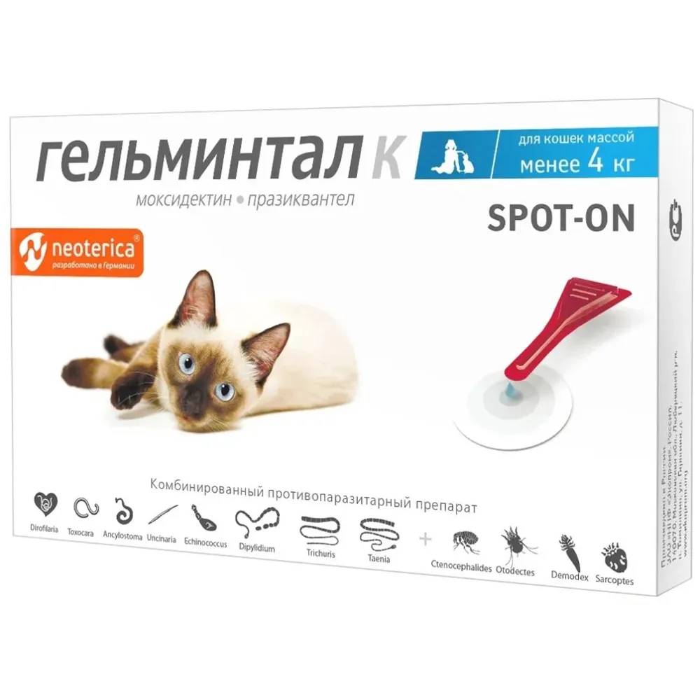 - Гельминтал spot-on назначают кошкам и собакам с лечебной и профилактической целью при кишечных нематодозах (токсокароз, токсаскаридоз, унцинариоз, анкилостомоз), цестодозах (тениидозы, дипилидиоз, эхинококкозы), а также в целях профилактики дирофиляриоза.