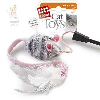 GiGwi Игрушка для кошек Дразнилка с музыкальным чипом на стеке Мышка пластик/перо 51 см