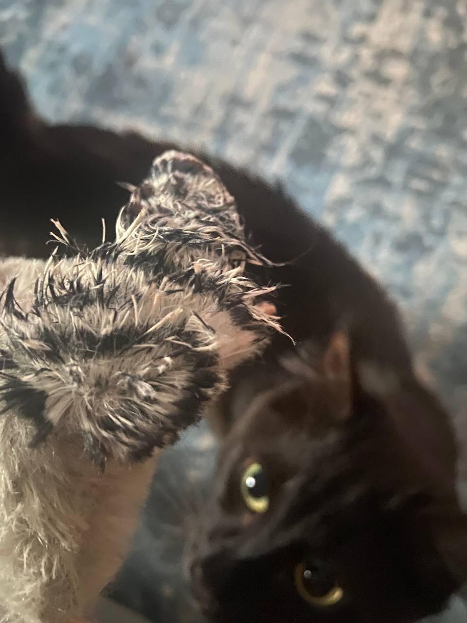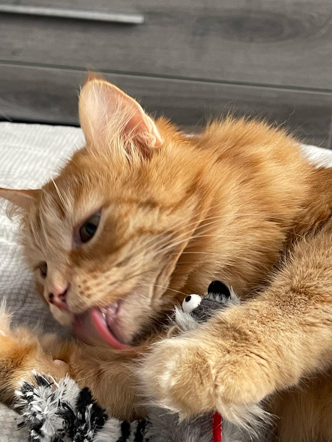 Кот в восторге, первая игрушка которую он не уничтожил за ночь.