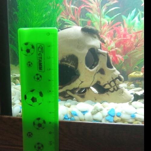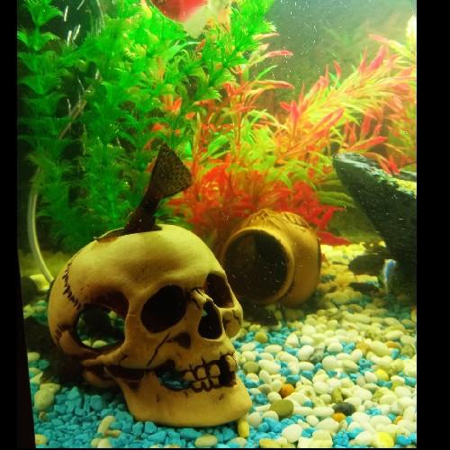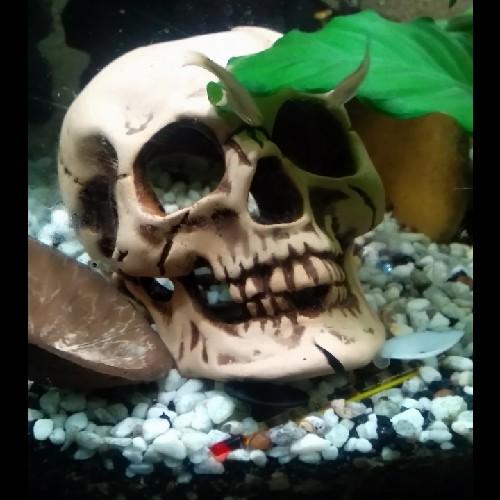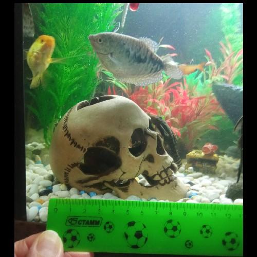 Хороший классический череп, золотая рыбка решила, что будет жить в нём. И прекрасно себя чувствует. Не мутит воду.Алина