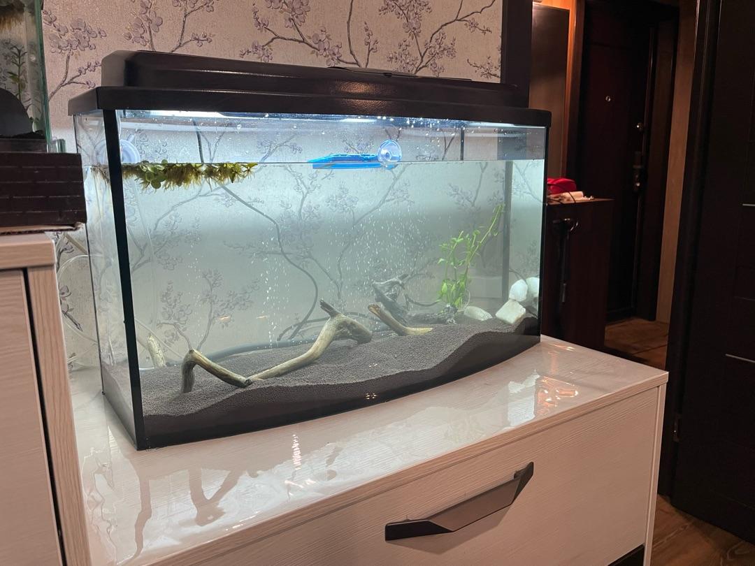 Аквариум с крышкой цвета венге, с лючком для кормления рыб, встроенная люминисцентная лампа.
