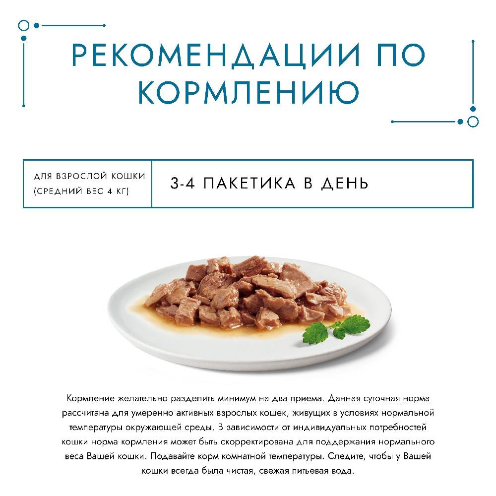 Для взрослой кошки среднего веса (4 кг) требуется 3-4 пакетика в день. Кормление желательно разделить минимум на два приема.