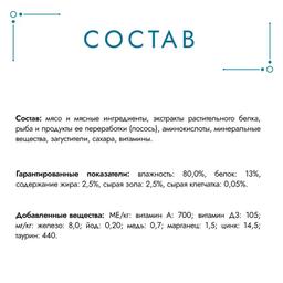 мясо и мясные ингредиенты, экстракты растительного белка, рыба и продукты ее переработки (лосось), аминокислоты, минеральные вещества, загустители, сахара, витамины.