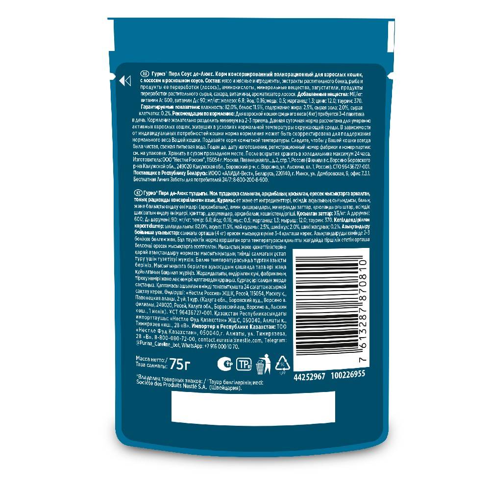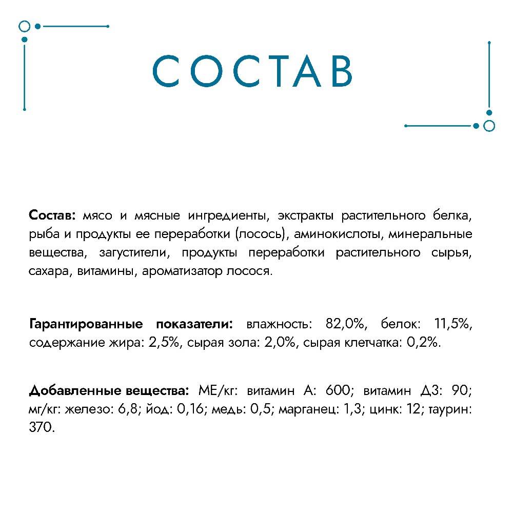 мясо и мясные ингредиенты, экстракты растительного белка, рыба и продукты ее переработки (лосось), аминокислоты, минеральные вещества, загустители, продукты переработки растительного сырья, сахара, витамины, ароматизатор лосося.