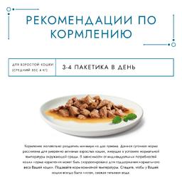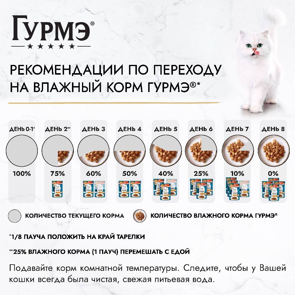 Кормление желательно разделить минимум на два приема. Данная суточная норма рассчитана для умеренно активных взрослых кошек, живущих в условиях нормальной температуры окружающей среды. В зависимости от индивидуальных потребностей кошки норма кормления может быть скорректирована для поддержания нормального веса Вашей кошки.