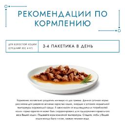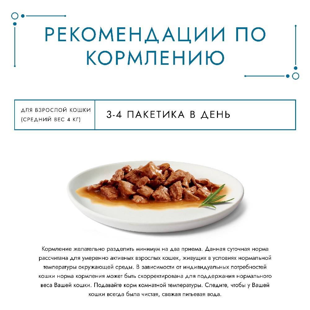 Кормление желательно разделить минимум на два приема. Данная суточная норма рассчитана для умеренно активных взрослых кошек, живущих в условиях нормальной температуры окружающей среды. В зависимости от индивидуальных потребностей кошки норма кормления может быть скорректирована для поддержания нормального веса Вашей кошки.