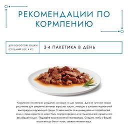 Кормление желательно разделить минимум на два приема. Данная суточная норма рассчитана для умеренно активных взрослых кошек, живущих в условиях нормальной температуры окружающей среды. В зависимости от индивидуальных потребностей кошки норма кормления может быть скорректирована для поддержания нормального веса Вашей кошки.