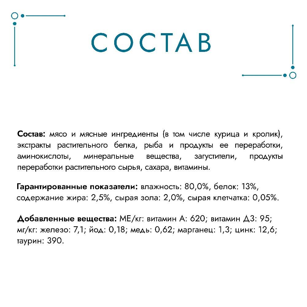 мясо и мясные ингредиенты (в том числе курица и кролик), экстракты растительного белка, аминокислоты, рыба и продукты ее переработки, минеральные вещества, загустители, сахара, витамины.