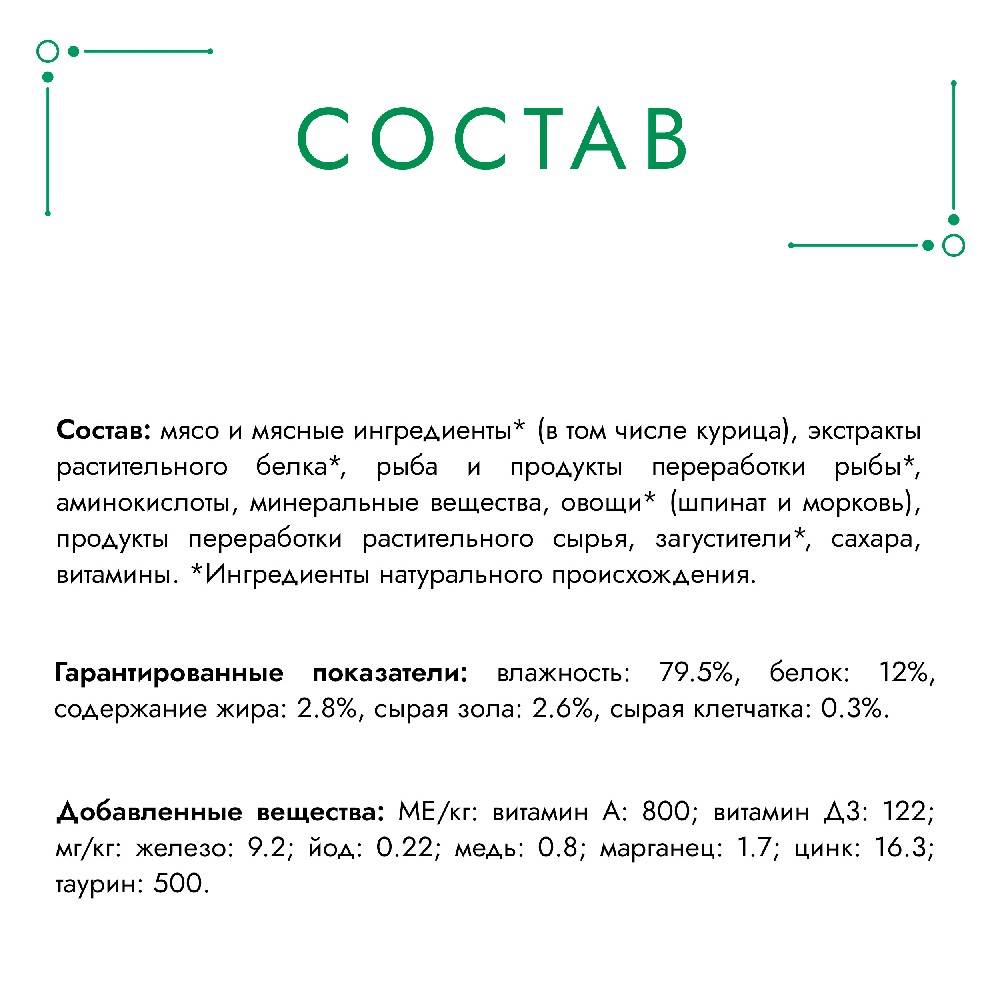 мясо и мясные ингредиенты* (включая индейку), экстракты растительного белка*, овощи* (горошек и кабачки), аминокислоты, рыба и продукты ее переработки, минеральные вещества, загустители*, продукты переработки растительного сырья, сахара, витамины. *Ингредиенты натурального происхождения.
