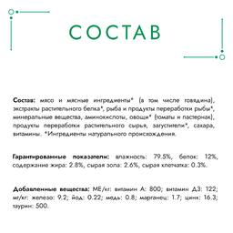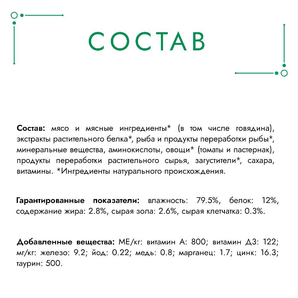 мясо и мясные ингредиенты* (включая говядину), экстракты растительного белка*, рыба и продукты ее переработки*, аминокислоты, овощи* (томаты и пастернак), минеральные вещества, загустители*, сахара, продукты переработки растительного сырья, витамины. *Ингредиенты натурального происхождения.