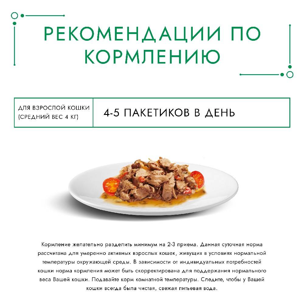 Для взрослой кошки среднего веса (4 кг) требуется 4 пакетика в день. Кормление желательно разделить минимум на два приема.