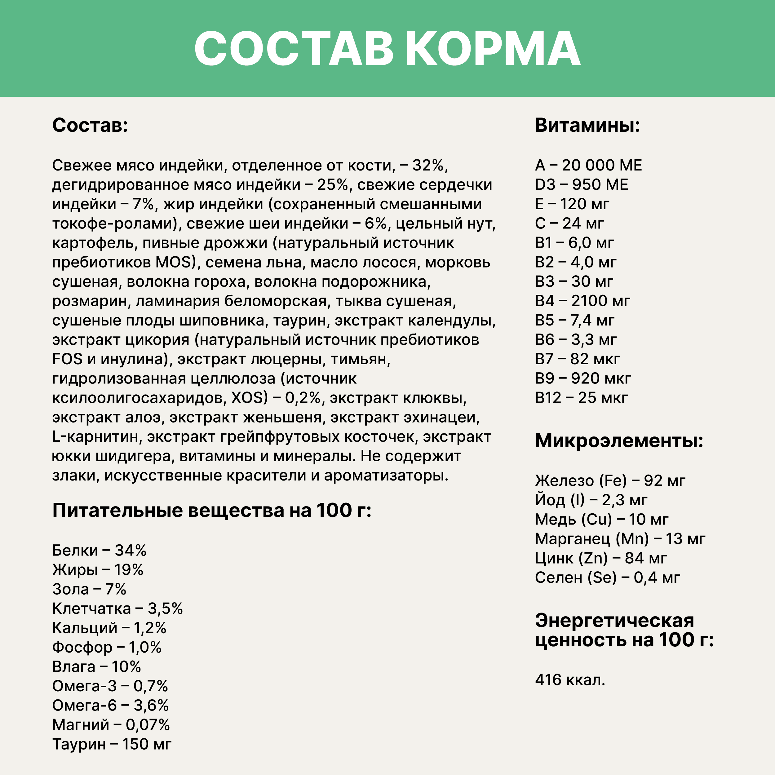 В составе — свежее мясо и дегидрированное мясо индейки (всего 57%), а также сердечки и шеи индейки — источник легкоусвояемого белка и аминокислот. Нут и картофель заменяют злаки, обеспечивая питомца энергией без лишней нагрузки на ЖКТ. Клюква, шиповник и календулa богаты антиоксидантами и помогают поддерживать здоровье мочевыделительной системы. Масло лосося и семена льна содержат Омега-3 и Омега-6 кислоты — для блестящей шерсти и здоровья кожи. Пивные дрожжи, экстракт цикория и подорожник — натуральные пребиотики, способствующие комфортному пищеварению. Экстракты женьшеня, эхинацеи и алоэ поддерживают иммунитет и общий тонус организма.