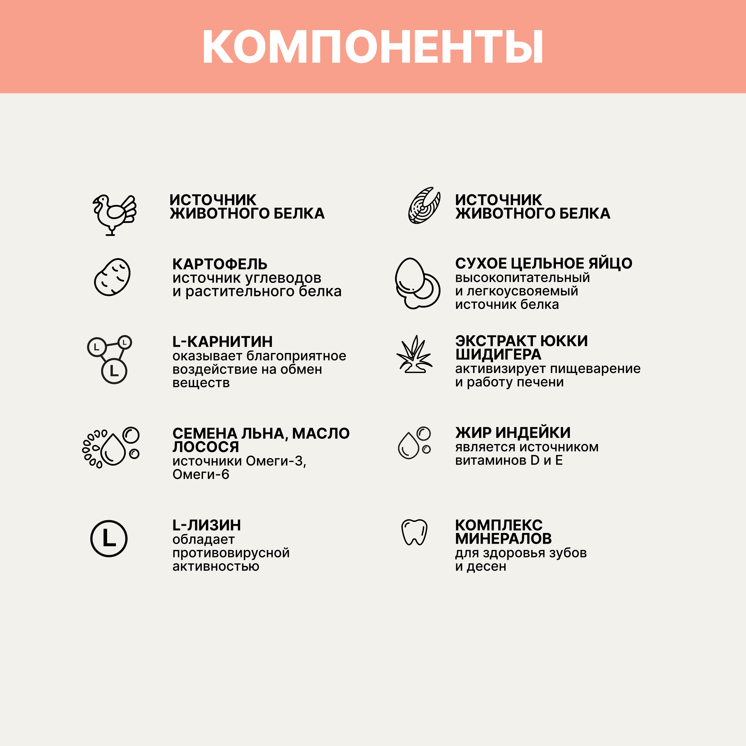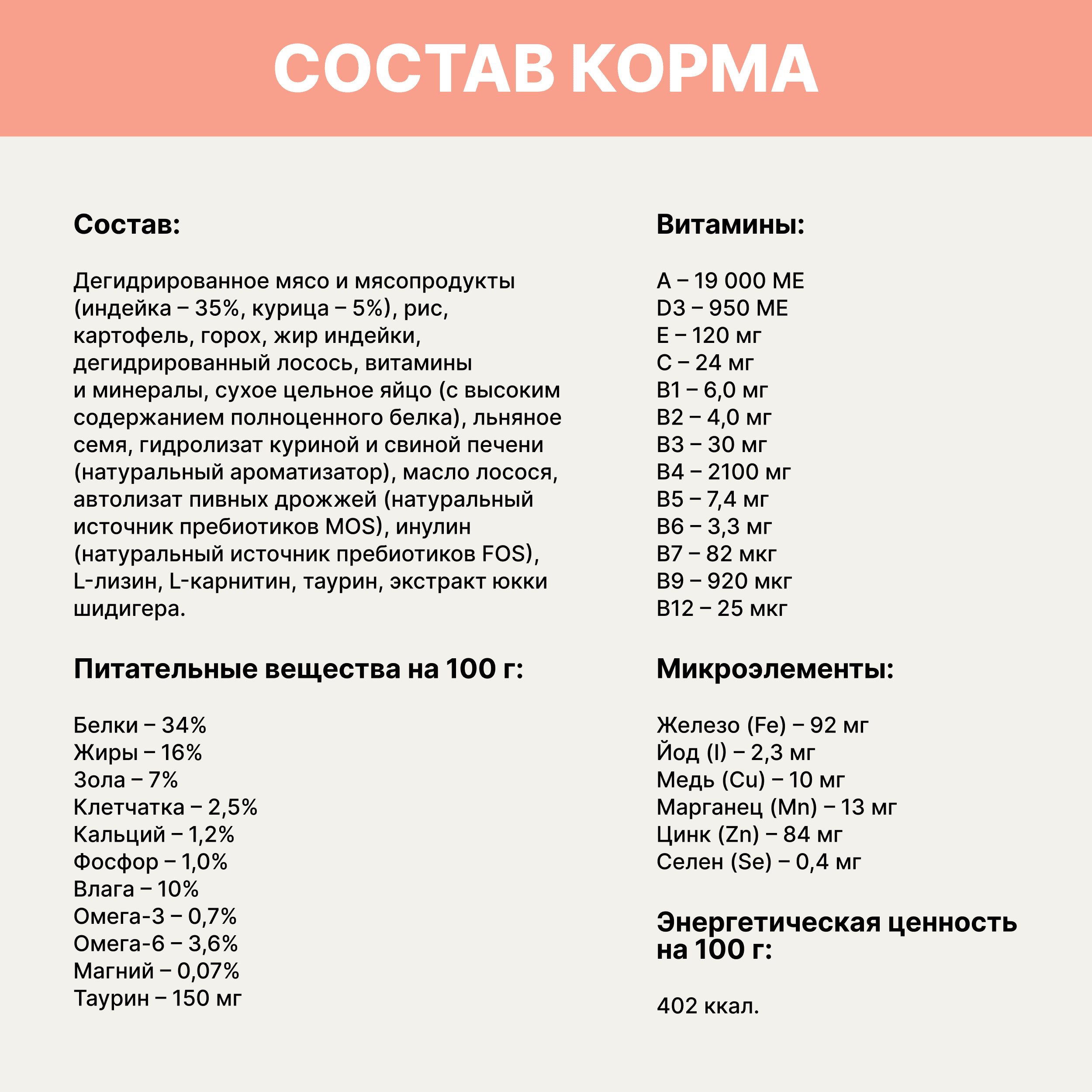 В основе — мясо индейки (35%) и курицы (5%), обеспечивающее питомца высококачественным белком и аминокислотами. Рис, картофель и горох дают энергию без перегрузки желудка, а яйцо добавляет полноценный белок и делает корм особенно аппетитным. Жир индейки и масло лосося богаты Омега-3 и Омега-6 жирными кислотами — для блестящей шерсти, здоровой кожи и крепкого сердца. Пивные дрожжи и инулин — натуральные пребиотики MOS и FOS, поддерживающие пищеварение и укрепляющие иммунитет. L-карнитин, L-лизин и таурин помогают поддерживать мышечный тонус и здоровье сердца. А гидролизат печени придаёт корму натуральный аромат, который нравится даже самым привередливым кошкам.