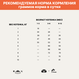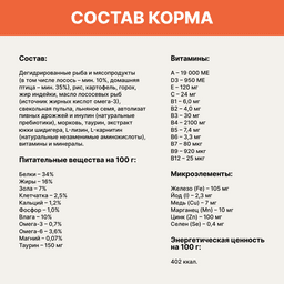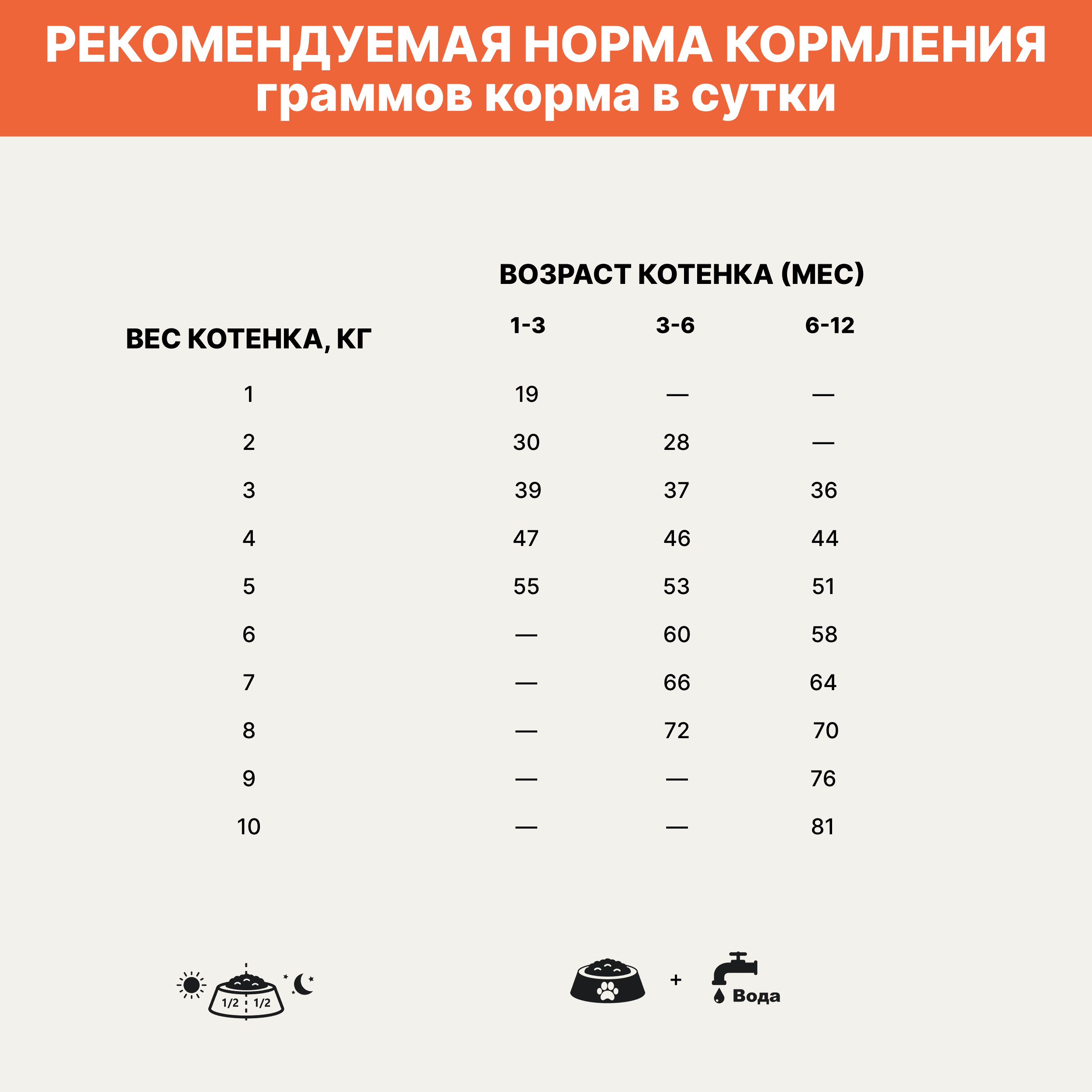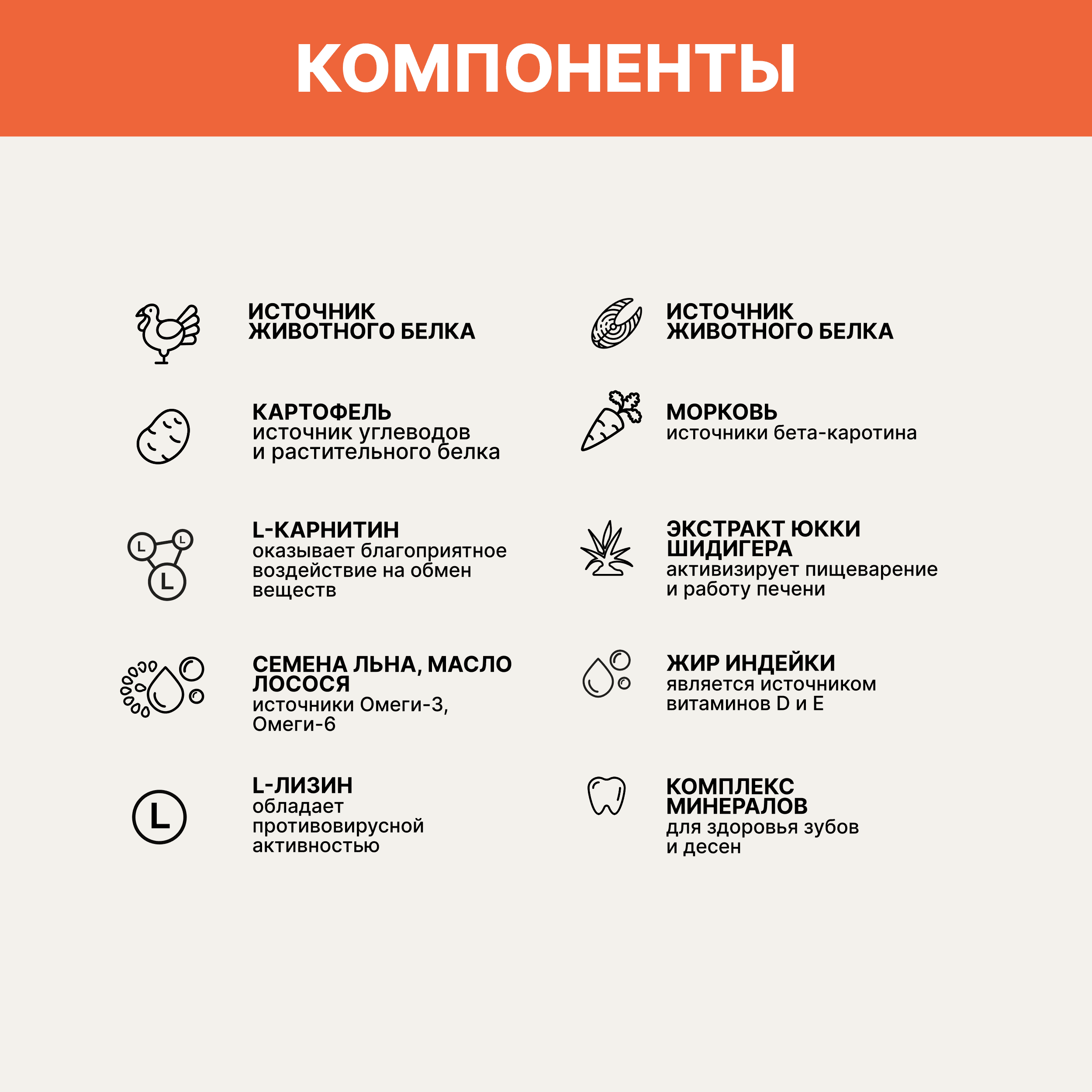 В основе рациона — лосось и мясо домашней птицы (всего не менее 45%), которые обеспечивают организм котёнка полноценным белком и аминокислотами. Рис, картофель и горох — лёгкие источники энергии для активных игр и роста. Масло лососевых рыб и жир индейки — источник жирных кислот Омега-3 и Омега-6, которые поддерживают здоровье кожи, блеск шерсти и работу сердца. Пивные дрожжи и инулин — натуральные пребиотики, помогающие формировать здоровую микрофлору кишечника. L-лизин и L-карнитин способствуют развитию мышц и укреплению иммунитета, а таурин поддерживает зрение и работу сердца.