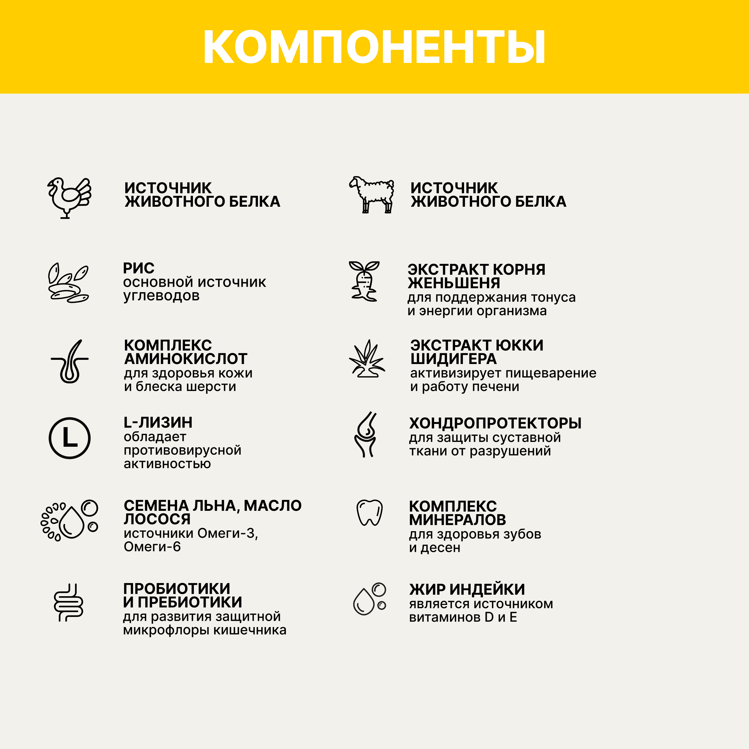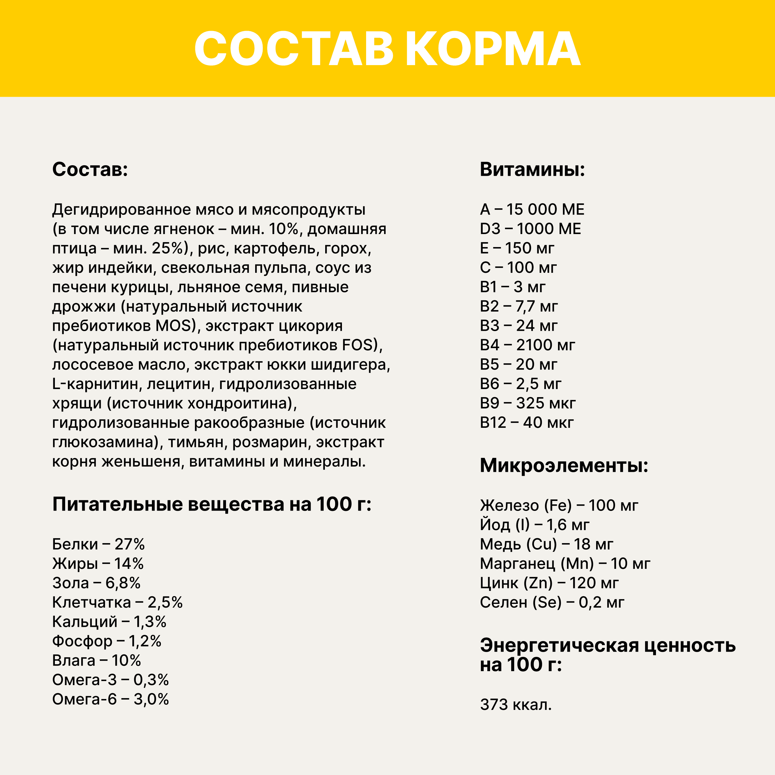 В составе — мясо ягненка и домашней птицы (всего не менее 35%) — источник полноценного белка и аминокислот, необходимых для силы и выносливости. Рис, картофель и горох обеспечивают организм энергией без излишней нагрузки на желудок. Жир индейки и лососевое масло снабжают питомца жирными кислотами Омега-3 и Омега-6, которые улучшают состояние кожи и придают шерсти блеск. Пивные дрожжи и экстракт цикория — натуральные пребиотики, поддерживающие здоровую микрофлору кишечника. Глюкозамин и хондроитин способствуют подвижности суставов и защищают связки от износа. Экстракты тимьяна, розмарина и женьшеня усиливают обмен веществ и помогают поддерживать крепкий иммунитет.