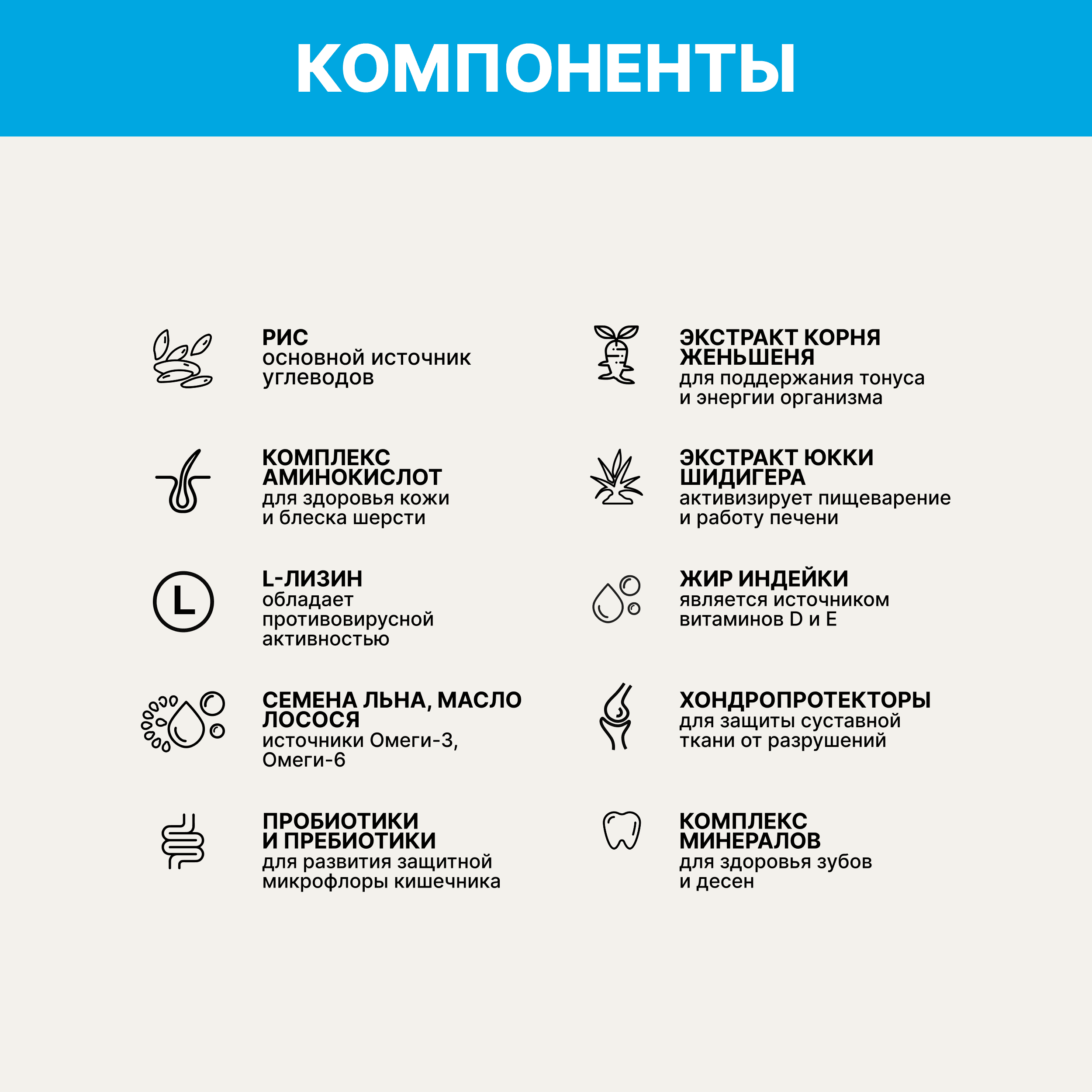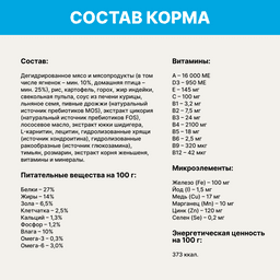 В составе — мясо ягненка и домашней птицы (всего не менее 35%), обеспечивающие питомца полноценным белком и необходимыми аминокислотами. Рис, картофель и горох служат лёгким источником энергии, не перегружающим пищеварение. Жир индейки и лососевое масло богаты Омега-3 и Омега-6 кислотами, поддерживающими здоровье кожи и блеск шерсти. Пивные дрожжи и экстракт цикория — натуральные пребиотики, которые способствуют здоровой микрофлоре кишечника. Глюкозамин и хондроитин укрепляют суставы и связки, а L-карнитин и лецитин поддерживают обмен веществ и мышечный тонус. Экстракты тимьяна, розмарина и женьшеня способствуют укреплению иммунитета и жизненного тонуса.