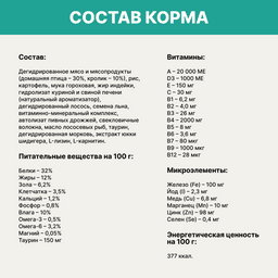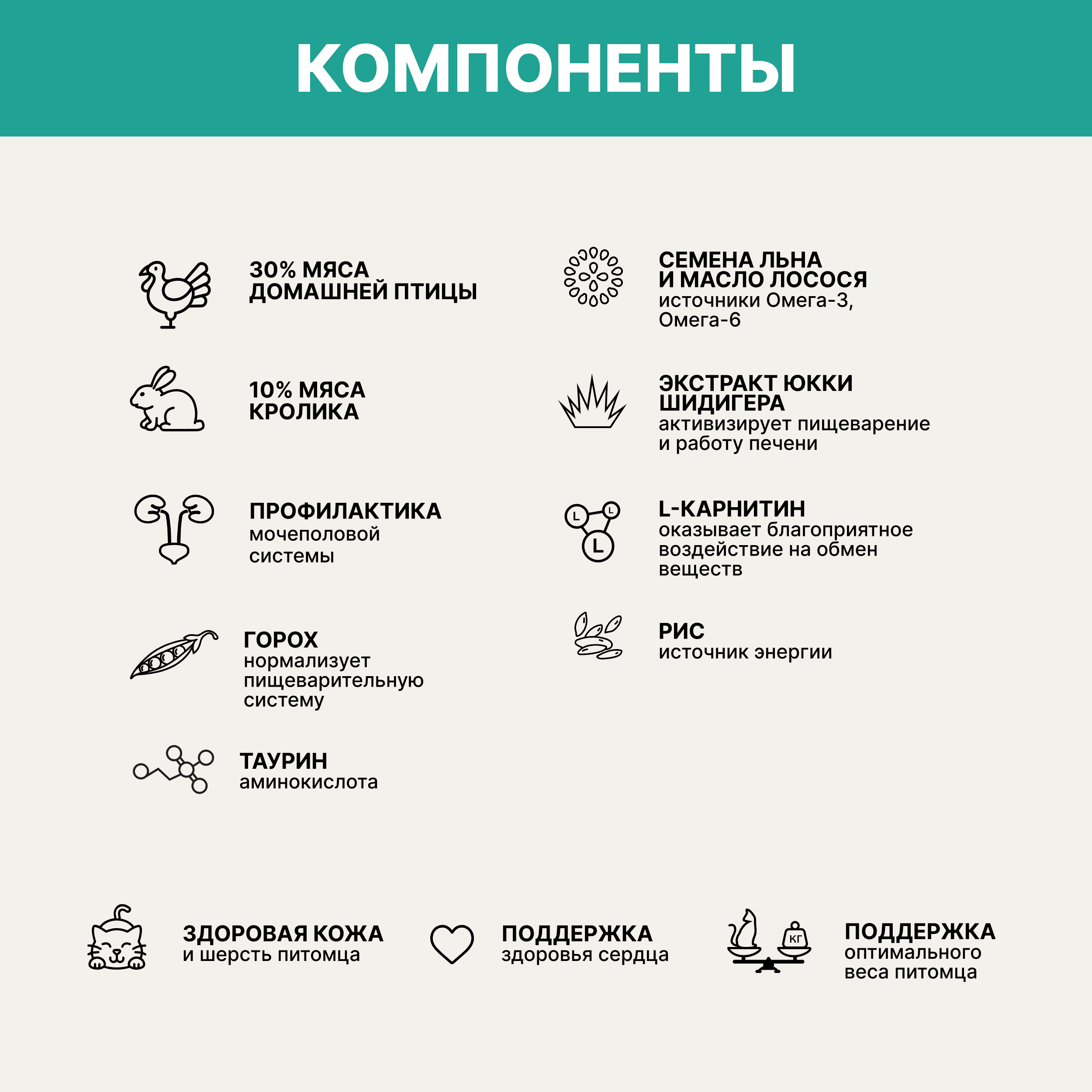 В составе — мясо кролика и домашней птицы (всего не менее 40%) — источник легкоусвояемого белка и аминокислот для крепких мышц и энергии. Рис и картофель — мягкие источники углеводов, которые не вызывают аллергии и обеспечивают стабильную энергию. Жир индейки и масло лососевых рыб снабжают питомца Омега-3 и Омега-6 жирными кислотами, поддерживающими здоровье кожи и блеск шерсти. Пивные дрожжи и семена льна способствуют хорошему пищеварению и крепкому иммунитету. L-карнитин и таурин поддерживают работу сердца и помогают контролировать вес. А экстракт юкки шидигера снижает запах и улучшает обмен веществ.