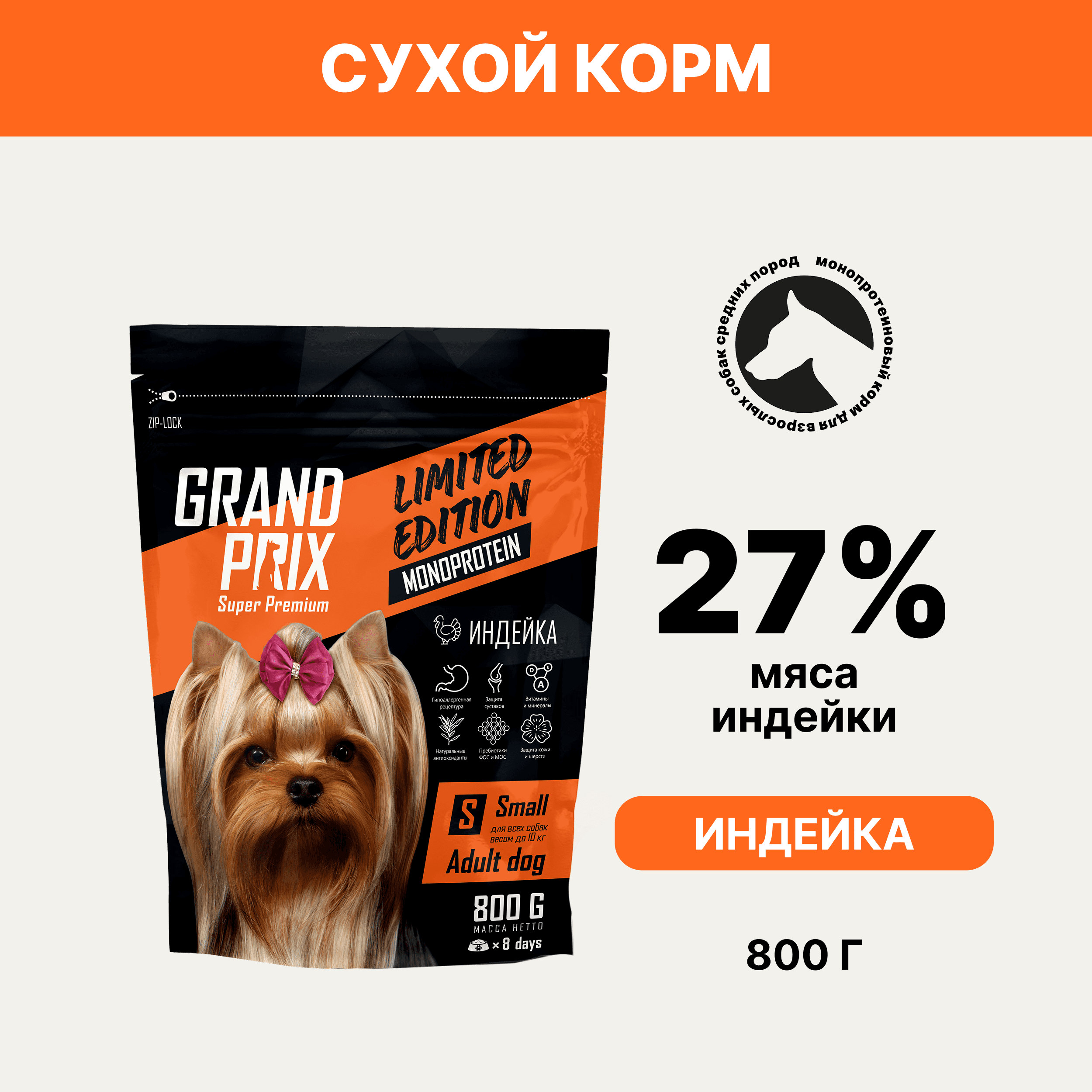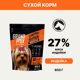 GRAND PRIX Small Adult Monoprotein — рацион для собак, склонных к аллергиям или чувствительным к питанию. В нём только один источник животного белка — мясо индейки (27%), легкоусвояемое и богатое витаминами группы B, A, E, K и микроэлементами, необходимыми для энергии и здоровья питомца.