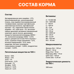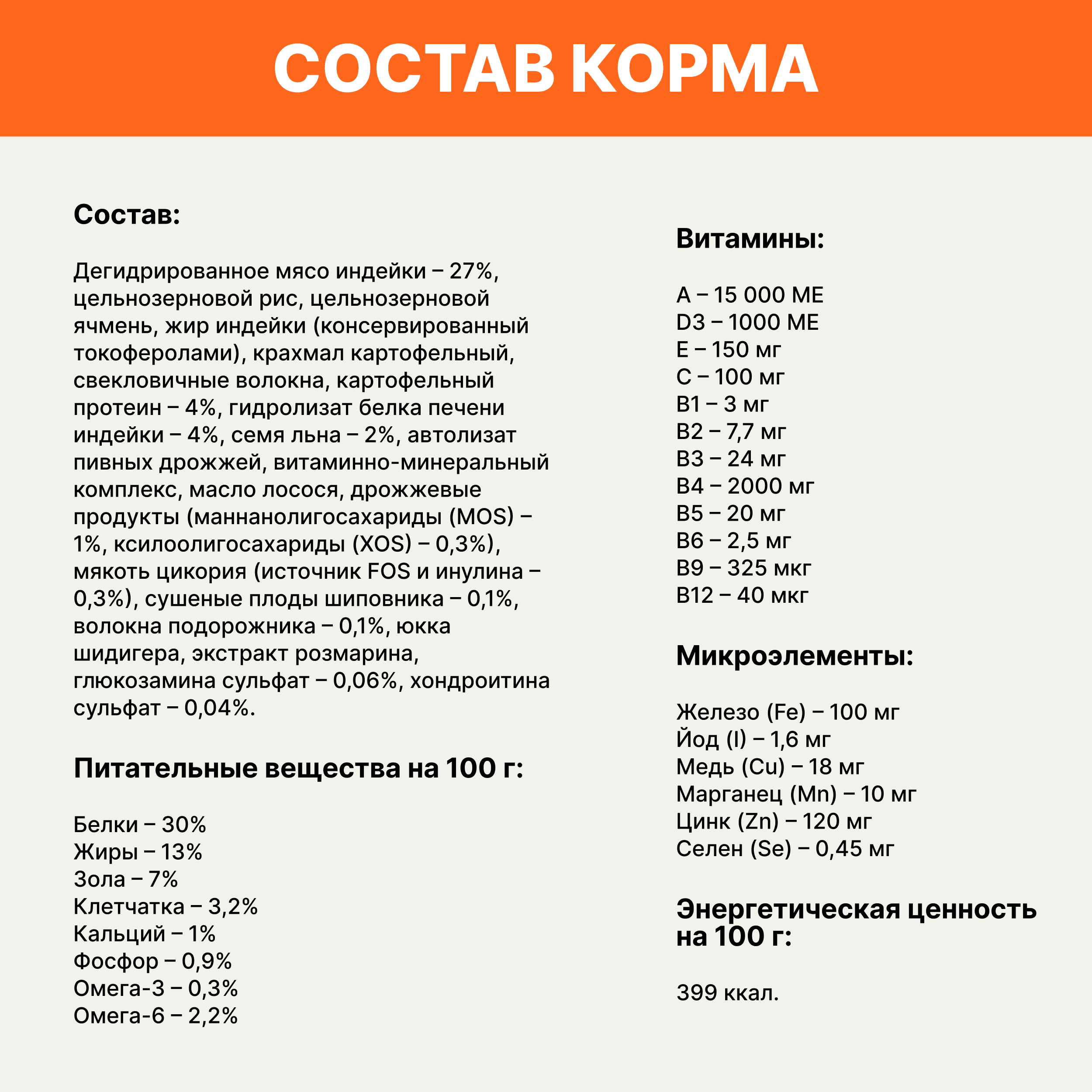 - Один источник белка — индейка, подходит при чувствительном пищеварении и аллергиях