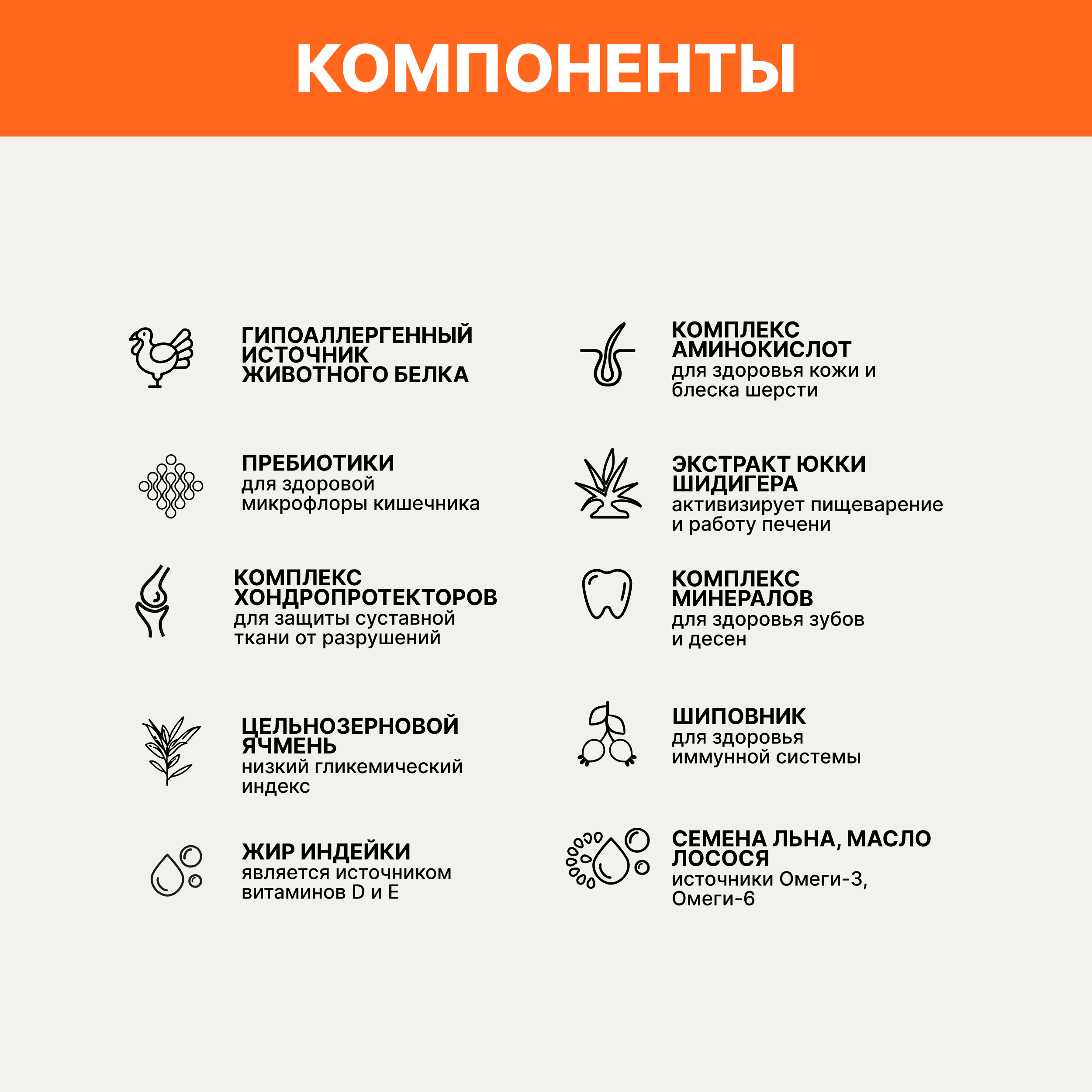 Цельнозерновой рис и ячмень обеспечивают организм безопасными углеводами с низким гликемическим индексом, поддерживая стабильный уровень сахара и энергии. Картофель и картофельный протеин добавляют витамины группы B и C, способствуя нормальному обмену веществ. Жир индейки, масло лосося и семена льна снабжают питомца жирными кислотами Омега-3 и Омега-6 — для здоровой кожи, блестящей шерсти и крепкого иммунитета. Пивные дрожжи, пребиотики заботятся о пищеварении и балансе микрофлоры кишечника. Глюкозамин и хондроитин поддерживают суставы, а экстракт шиповника действует как природный антиоксидант.