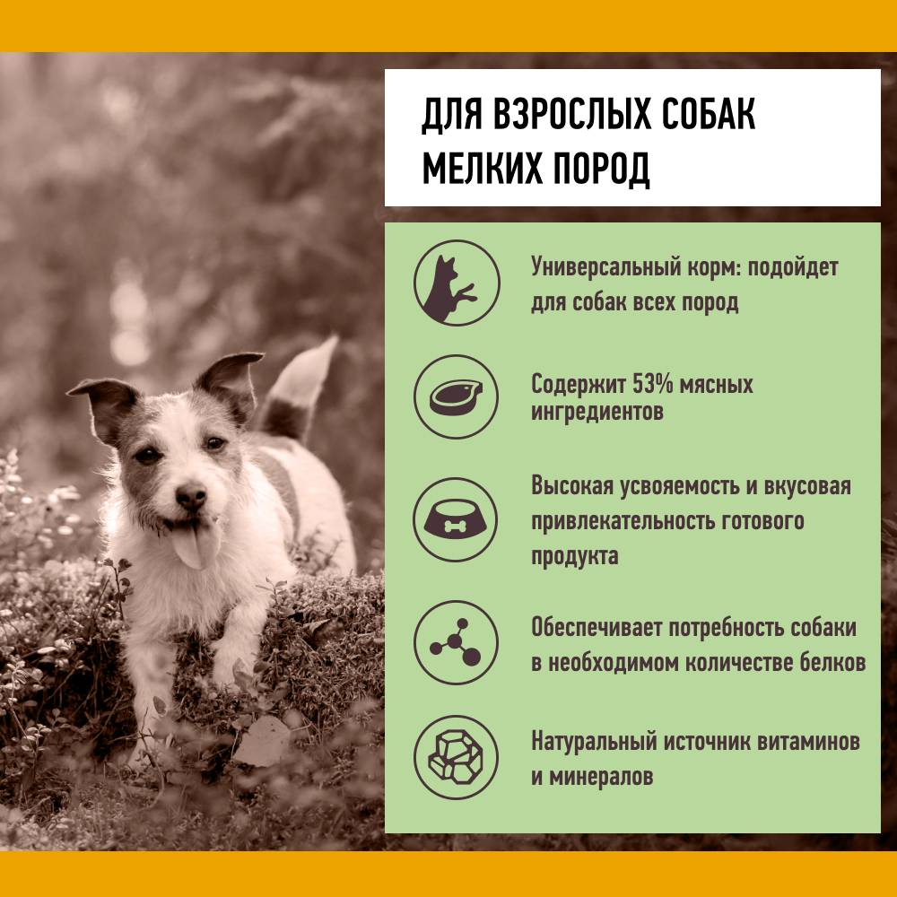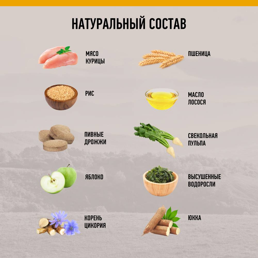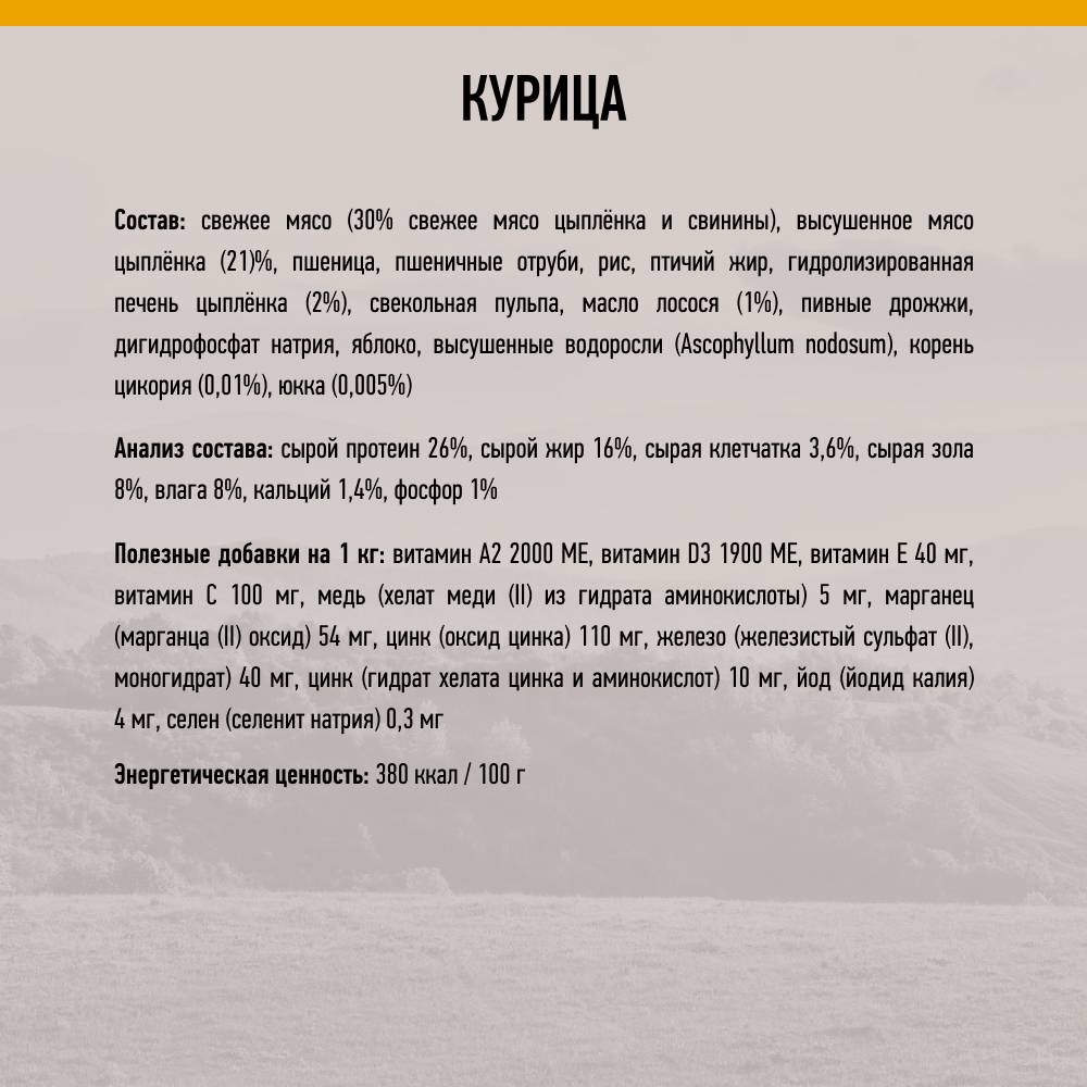 - В гранулах сухого корма содержится 53% ингредиентов животного происхождения, из которых 30% свежее мясо курицы, свинины, говядины. Это означает, что корм полностью обеспечивает потребность собаки в необходимом количестве белков и жизненной энергии.