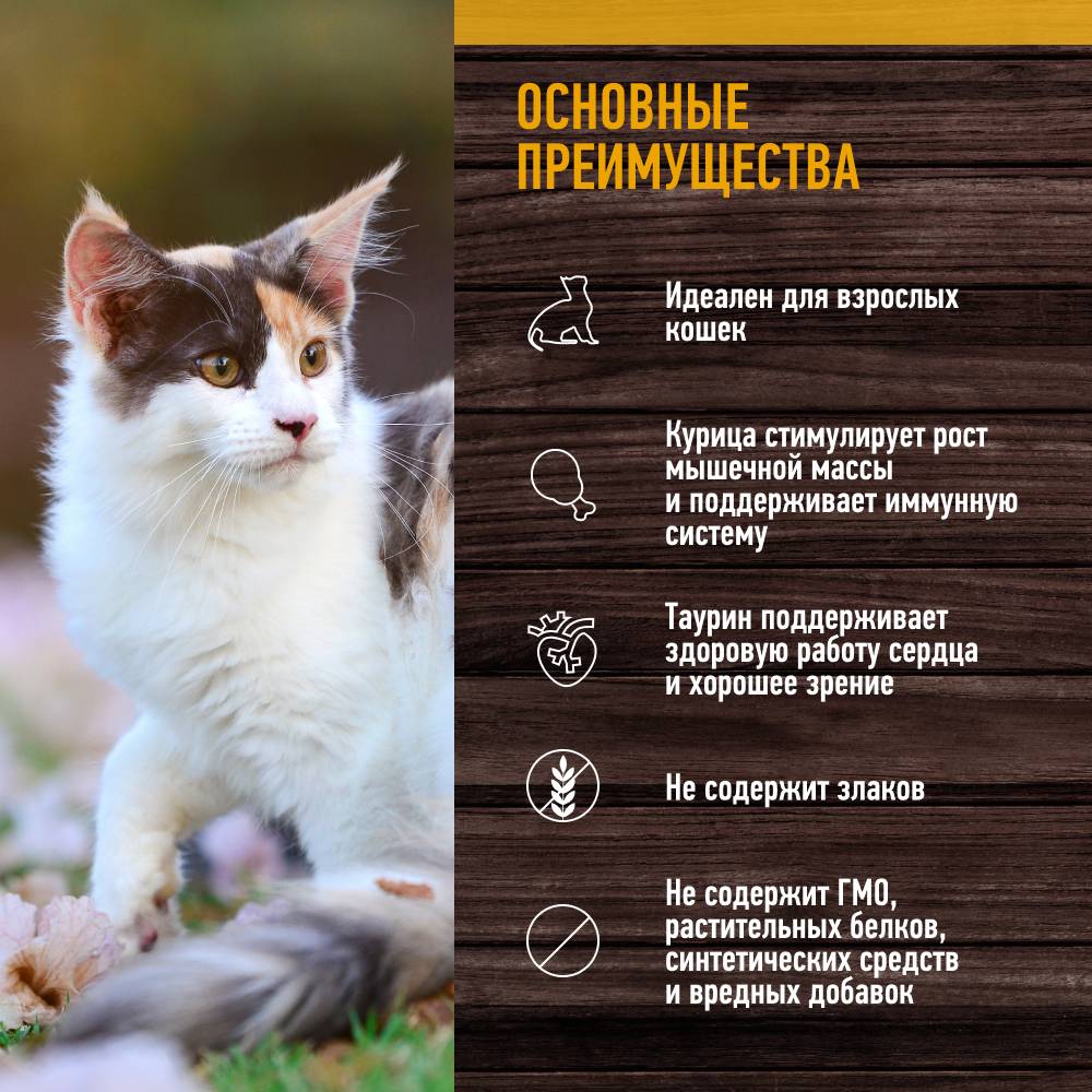 - Высокие стандарты качества корма класса супер-премиум: влажные корма для кошек по составу максимально приближены к природному рациону животных — не содержат ГМО, растительных белков, синтетических средств и вредных добавок.