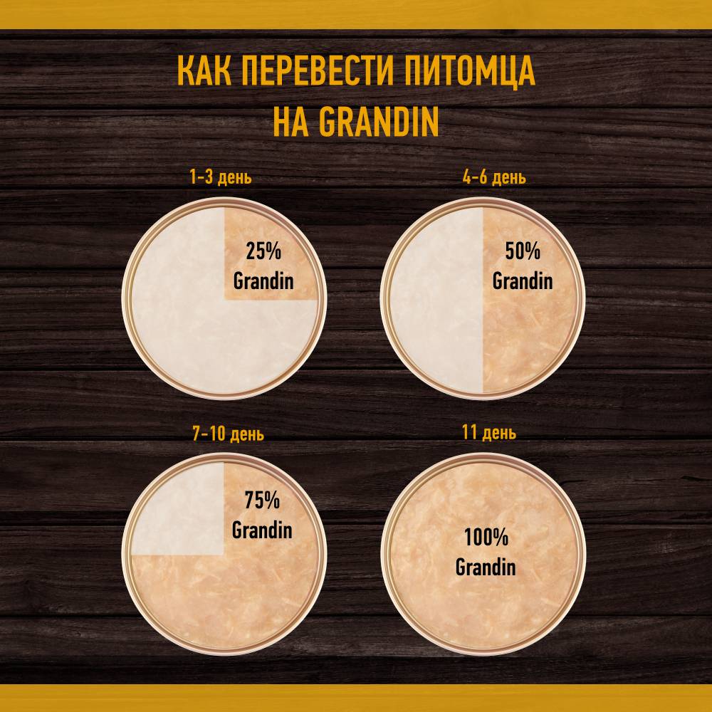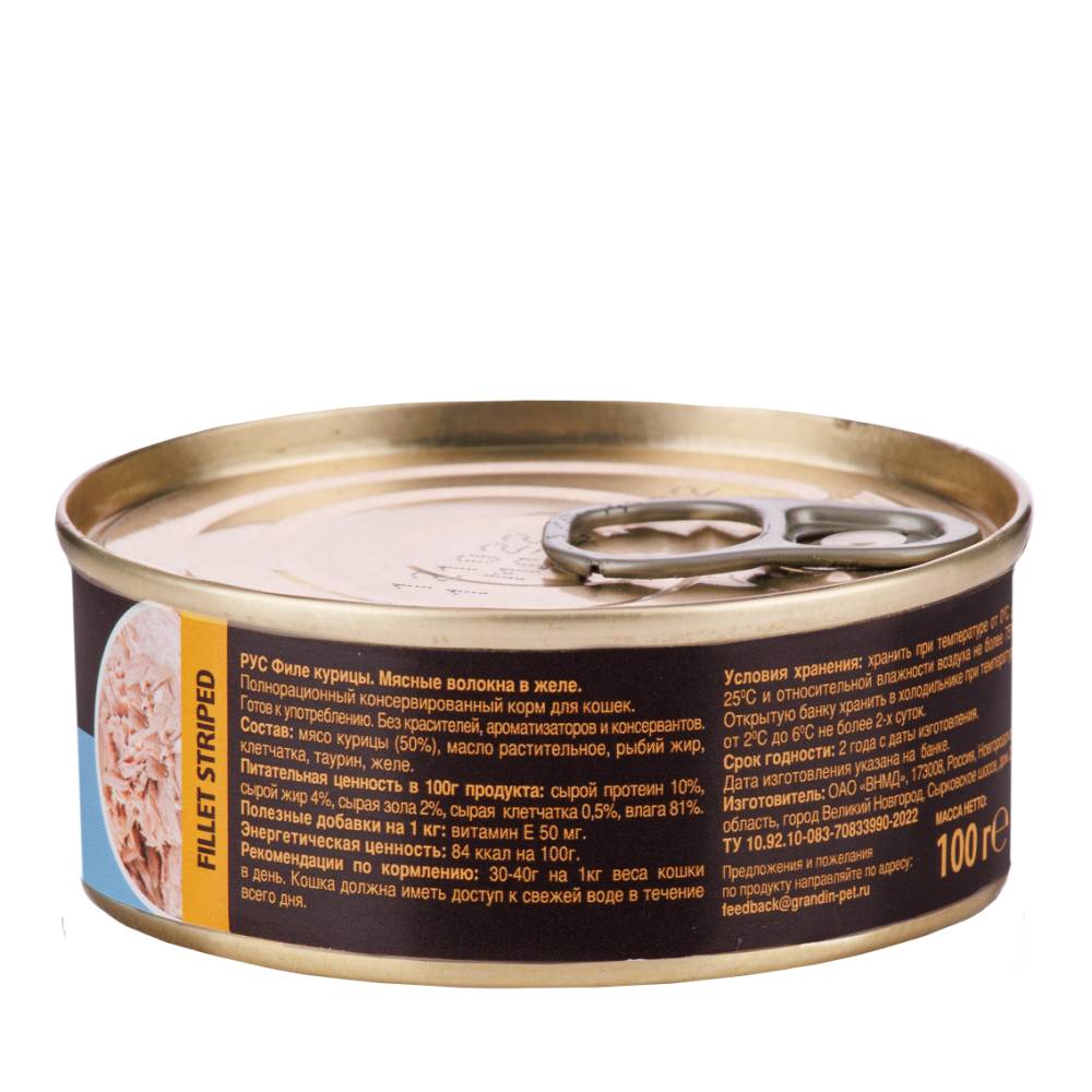 GRANDIN Мясные волокна курицы в желе — полнорационный консервированный корм для взрослых кошек с повышенным содержанием мяса.
