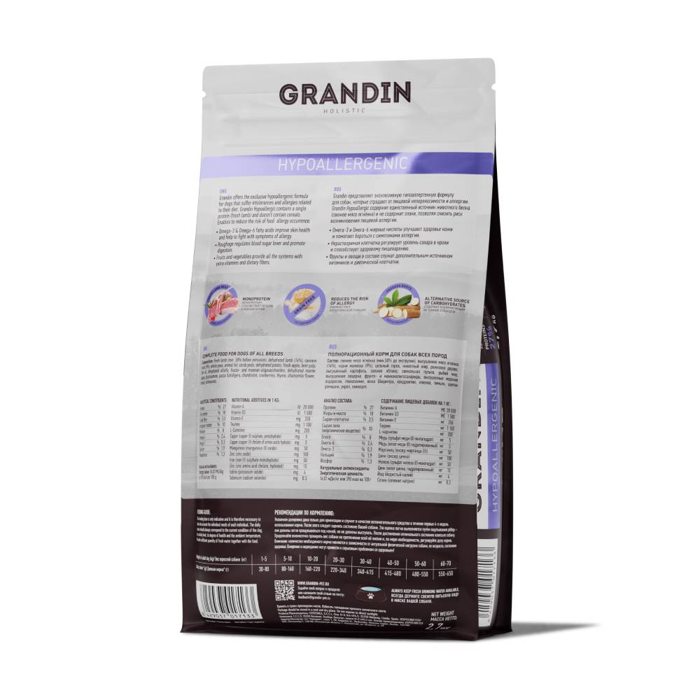 - Grandin Hypoallergenic содержит единственный источник животного белка (свежее мясо ягнёнка) и не содержит злаки, позволяя снизить риск возникновения пищевой аллергии.