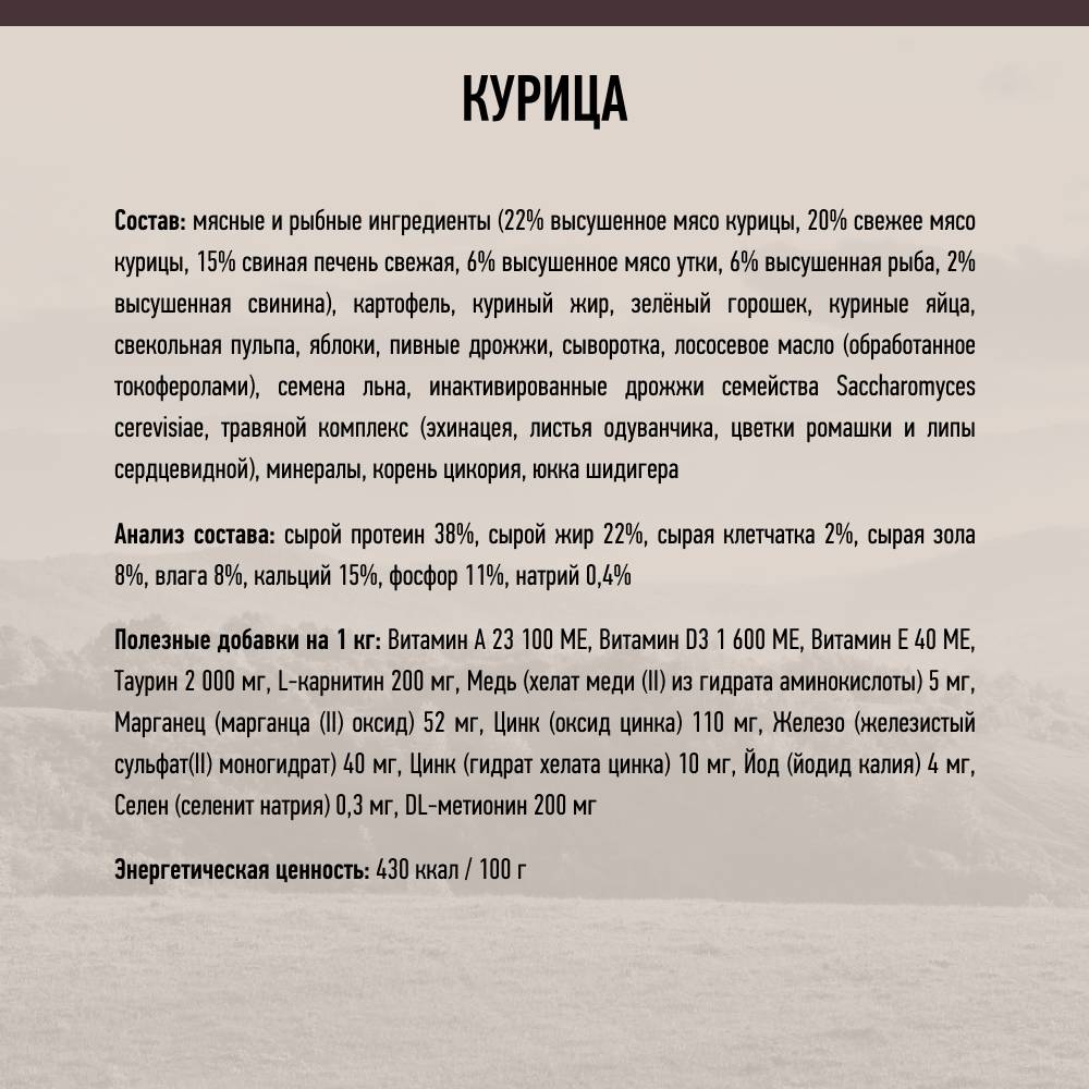 - Большое содержание мяса, из которого до 20% свежее мясо курицы.