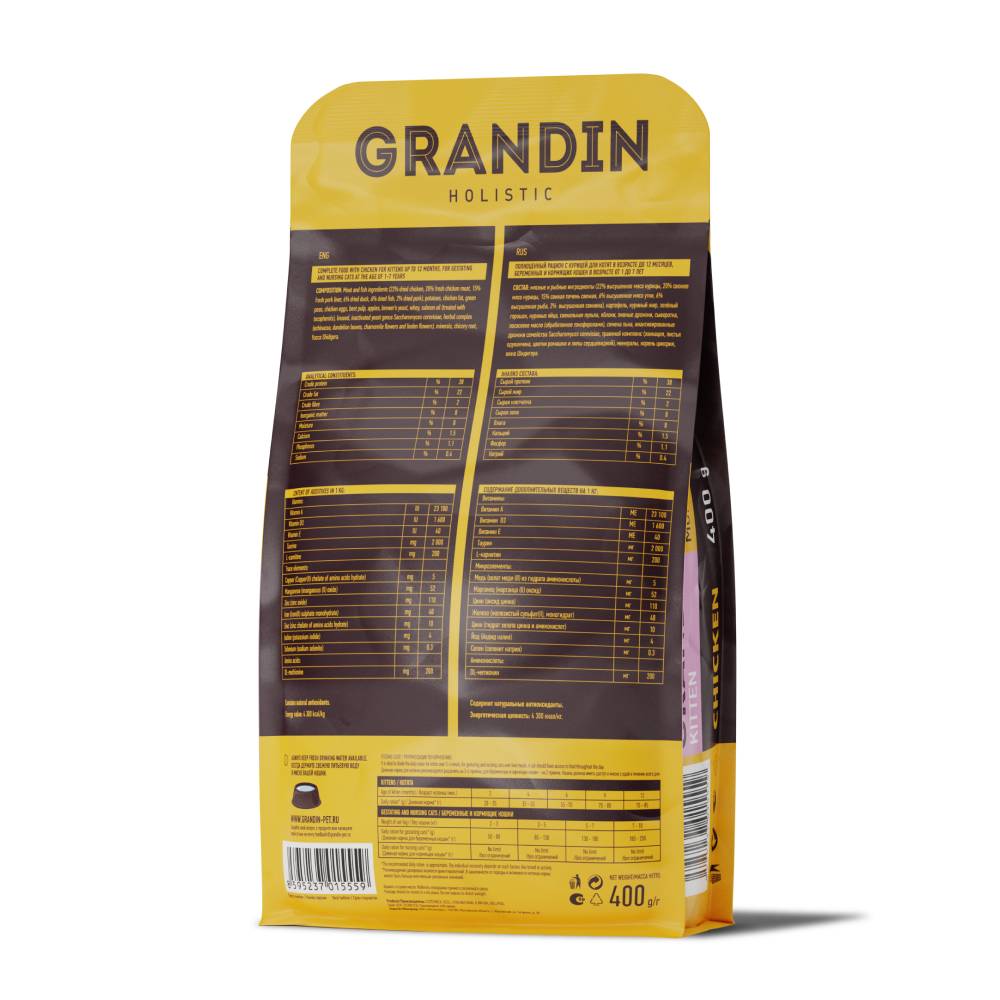GRANDIN Holistic Kitte — это полноценный сбалансированный рацион c курицей для котят в возрасте до 12 месяцев, беременных и кормящий кошек. Корм на основе свежего мяса, содержит все необходимые макро- и микроэлементы для здорового роста и развития молодого питомца.
