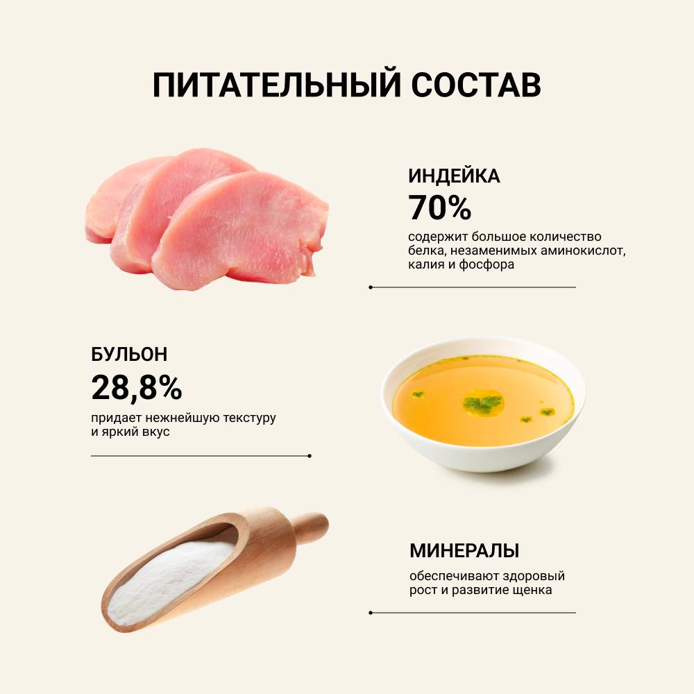 - Бульон и льняное масло в формуле корма обогащают его минералами и витаминами, которые положительно сказываются на активности и здоровье подрастающего питомца.