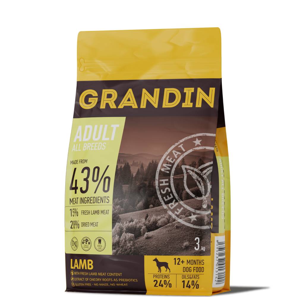 GRANDIN ADULT ALL BREEDS LAMB – это полнорационный сбалансированный корм для собак всех пород. Корм не содержит в составе пшеницу, поэтому подходит собакам, склонным к аллергии.