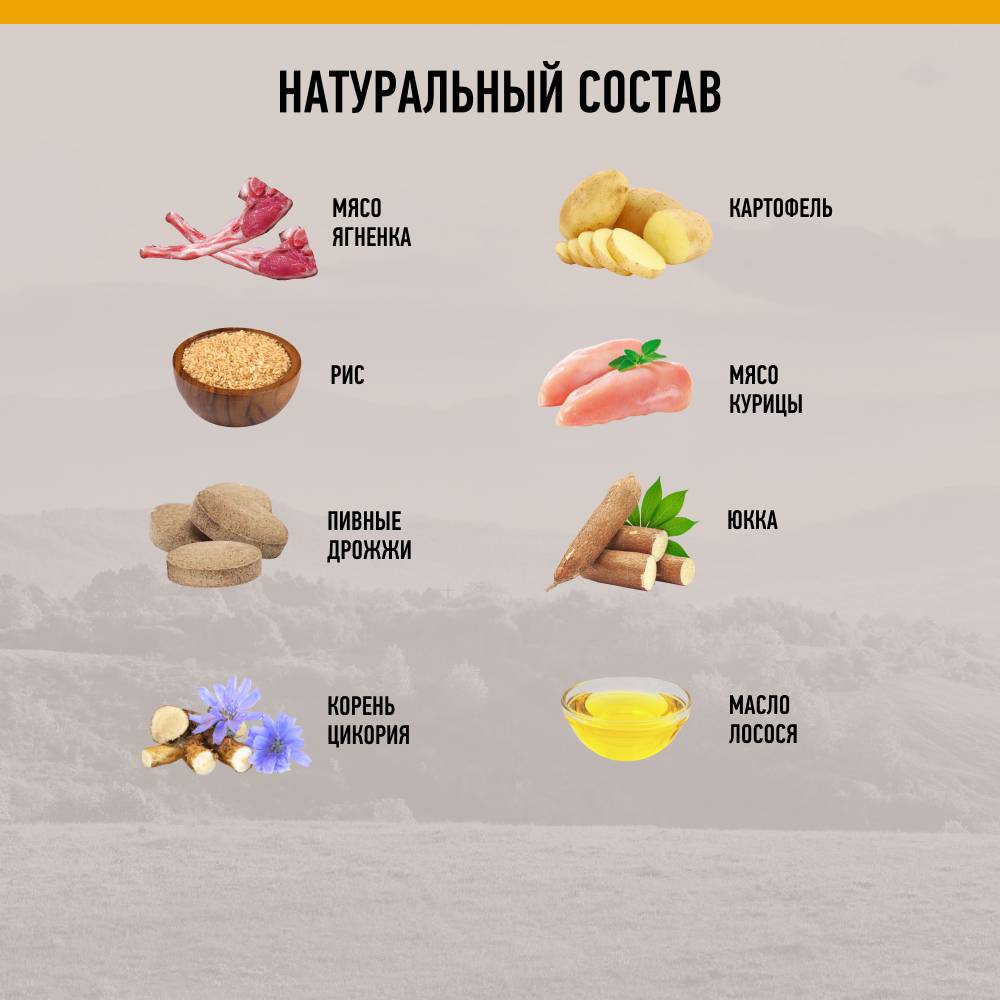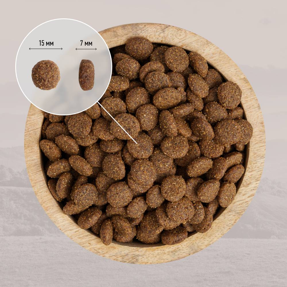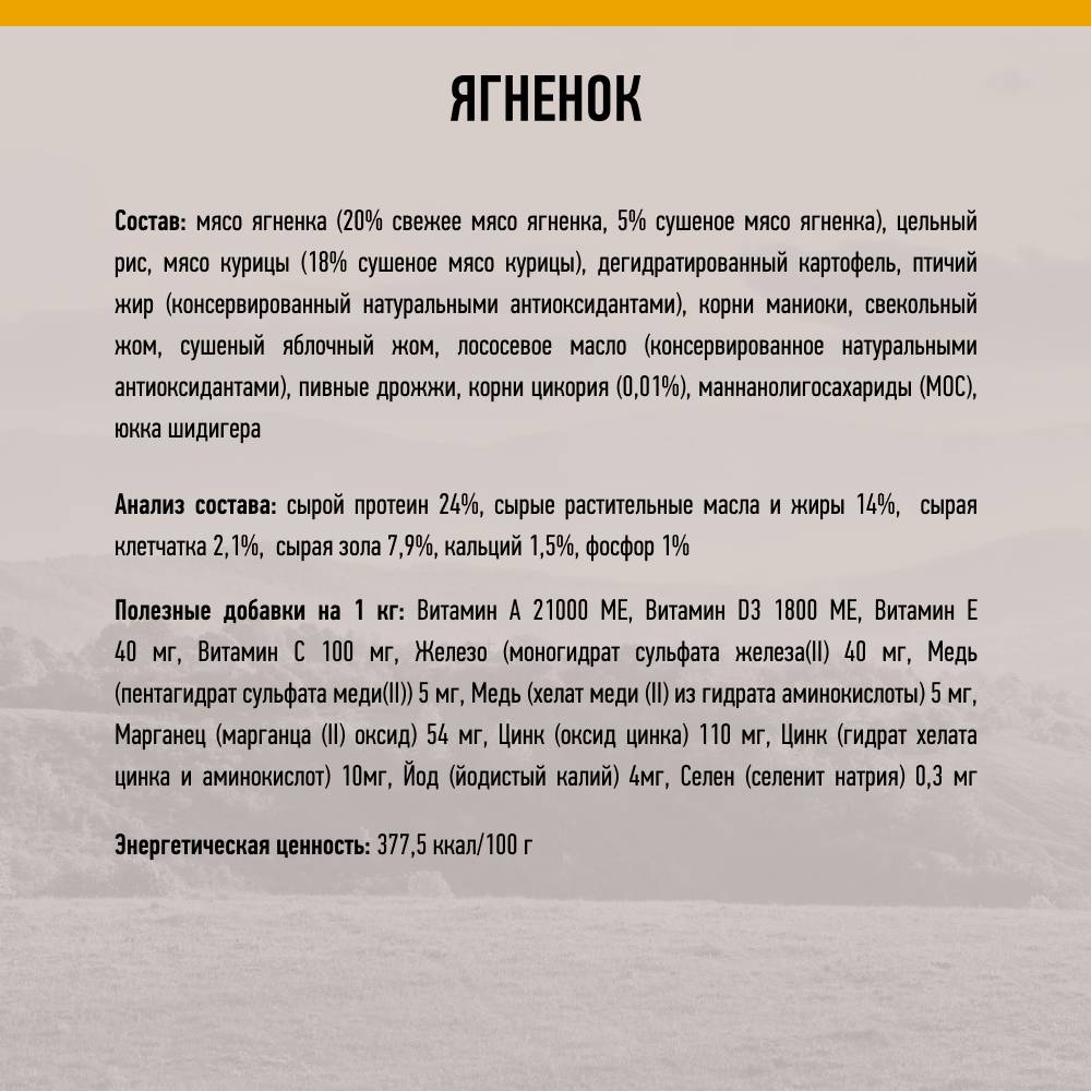 - В гранулах сухого корма содержится 43% ингредиентов животного происхождения, из которых 20% свежее мясо ягненка.