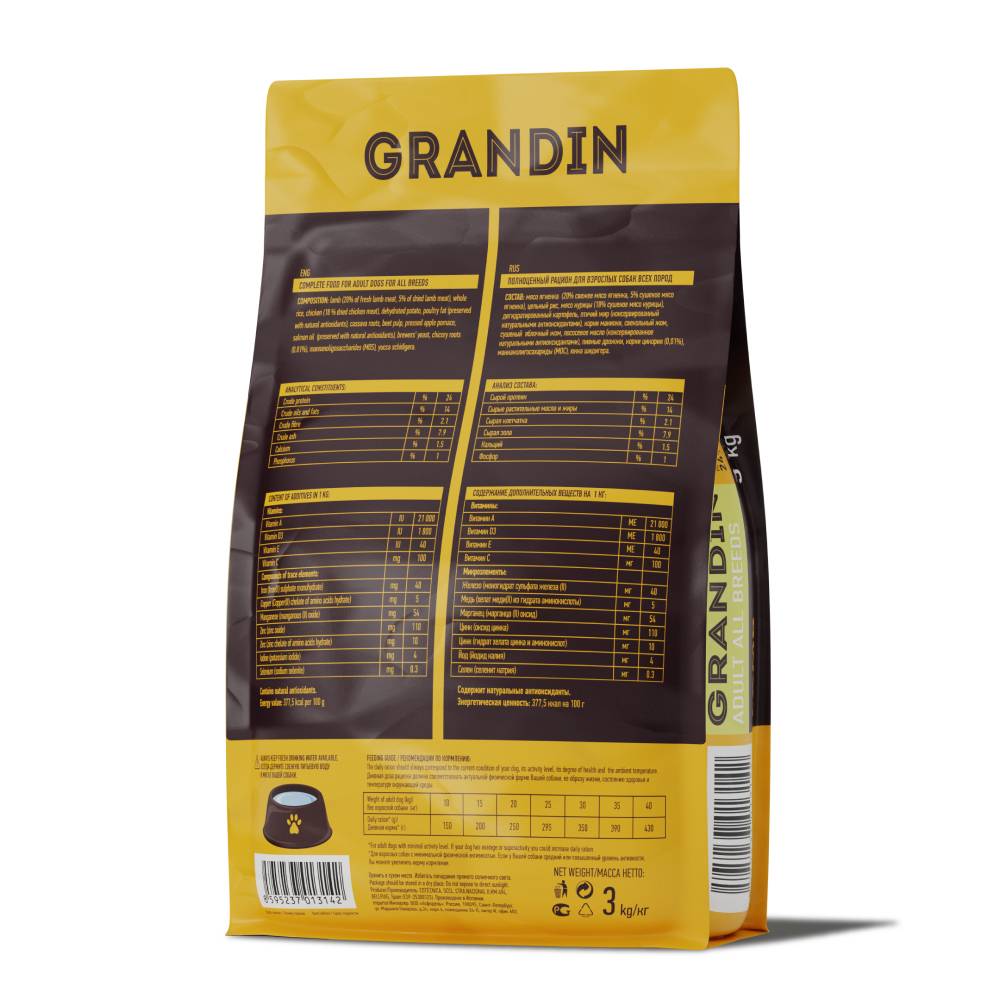 GRANDIN ADULT ALL BREEDS LAMB – это полнорационный сбалансированный корм для собак всех пород. Корм не содержит в составе пшеницу, поэтому подходит собакам, склонным к аллергии.